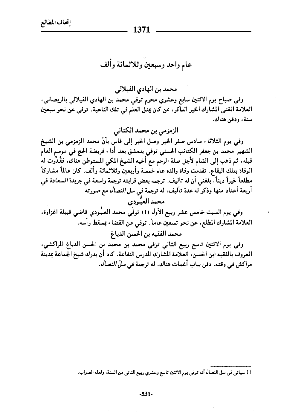 (¬1) سياتي في سل النصال أنه توفي يوم الاثنين تاسع وعشري ربيع الثاني من السنة، ولعله الصواب.