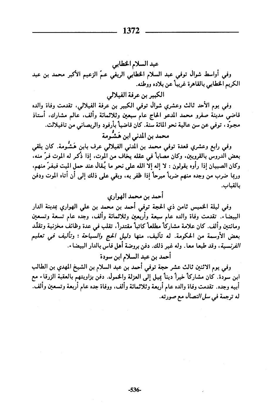 وفي ليلة الخميس ثامن ذي الحجة توفي أحمد بن محمد بن علي الهواري بمدينة الدار البيضاء. تقدمت وفاة والده عام سبعة وأربعين وثلاثمائة وألف، وجده عام تسعة وتسعين ومائتين وألف. كان علامة مشاركا مطلعا كاتبا مقتدرا، تقلب في عدة وظائف مخزنية وتقلّد بعض الأوسمة من الحكومة. له تآليف، منها دليل الحج والسياحة؛ وتأليف في تعليم الفرنسية، وقد طبعا معا. وله غير ذلك. دفن بروضة أهل فاس بالدار البيضاء.