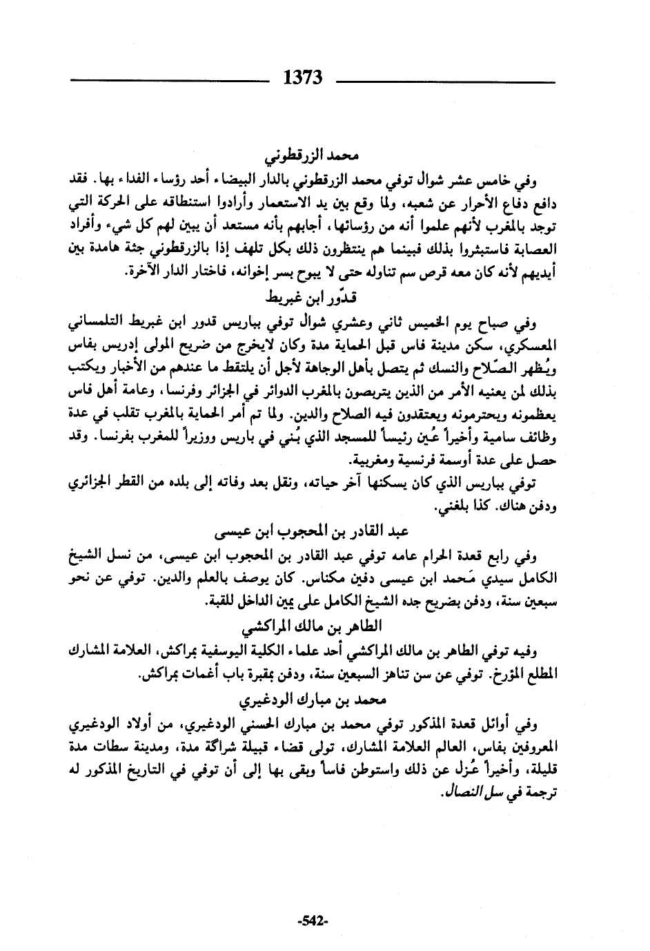 وفي صباح يوم الخميس ثاني وعشري شوال توفي بباريس قدور ابن غبريط التلمساني المعسكري، سكن مدينة فاس قبل الحماية مدة وكان لا يخرج من ضريح المولى إدريس بفاس ويظهر الصّلاح والنسك ثم يتصل بأهل الوجاهة لأجل أن يلتقط ما عندهم من الأخبار ويكتب بذلك لمن يعنيه الأمر من الذين يتربصون بالمغرب الدوائر في الجزائر وفرنسا، وعامة أهل فاس يعظمونه ويحترمونه ويعتقدون فيه الصلاح والدين. ولما تم أمر الحماية بالمغرب تقلب في عدة وظائف سامية وأخيرا عين رئيسا للمسجد الذي بني في باريس ووزيرا للمغرب بفرنسا. وقد حصل على عدة أوسمة فرنسية ومغربية.