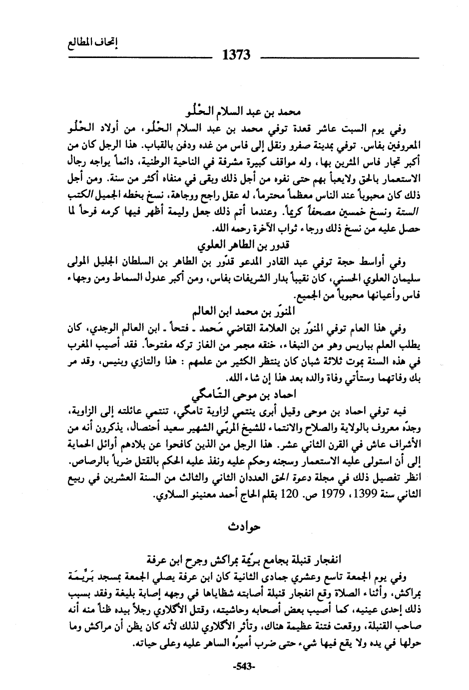 وفي يوم السبت عاشر قعدة توفي محمد بن عبد السلام الحلو، من أولاد الحلو المعروفين بفاس. توفي بمدينة صفرو ونقل إلى فاس من غده ودفن بالقباب. هذا الرجل كان من أكبر تجار فاس المثرين بها، وله مواقف كبيرة مشرفة في الناحية الوطنية، دائما يواجه رجال الاستعمار بالحق ولا يعبأ بهم حتى نفوه من أجل ذلك وبقى في منفاه أكثر من سنة. ومن أجل ذلك كان محبوبا عند الناس معظما محترما، له عقل راجح ووجاهة، نسخ بخطه الجميل الكتب الستة ونسخ خمسين مصحفا كريما. وعندما أتم ذلك جعل وليمة أظهر فيها كرمه فرحا لما حصل عليه من نسخ ذلك ورجاء ثواب الآخرة رحمه الله.