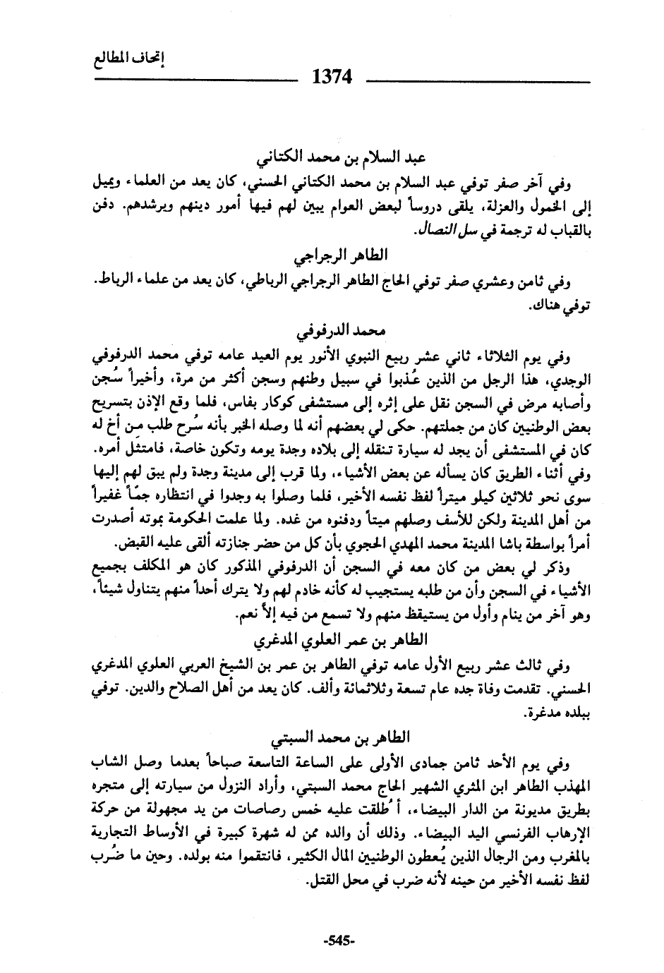 وفي يوم الثلاثاء ثاني عشر ربيع النبوي الأنور يوم العيد عامه توفي محمد الدرفوفي الوجدي، هذا الرجل من الذين عذبوا في سبيل وطنهم وسجن أكثر من مرة، وأخيرا سجن وأصابه مرض في السجن نقل على إثره إلى مستشفى كوكار بفاس، فلما وقع الإذن بتسريح بعض الوطنيين كان من جملتهم. حكى لي بعضهم أنه لما وصله الخبر بأنه سرح طلب من أخ له كان في المستشفى أن يجد له سيارة تنقله إلى بلاده وجدة يومه وتكون خاصة، فامتثل أمره.
