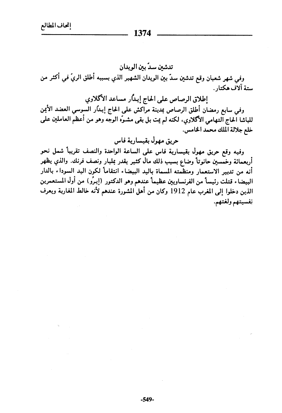 وفيه وقع حريق مهول بقيسارية فاس على الساعة الواحدة والنصف تقريبا شمل نحو أربعمائة وخمسين حانوتا وضاع بسبب ذلك مال كثير يقدر بمليار ونصف فرنك. والذي يظهر أنه من تدبير الاستعمار ومنظمته المسماة باليد البيضاء انتقاما لكون اليد السوداء بالدار البيضاء قتلت رئيسا من الفرنساويين عظيما عندهم وهو الدكتور (إيرو) من أول المستعمرين الذين دخلوا إلى المغرب عام 1912 وكان من أهل المشورة عندهم لأنه خالط المغاربة ويعرف نفسيتهم ولغتهم.