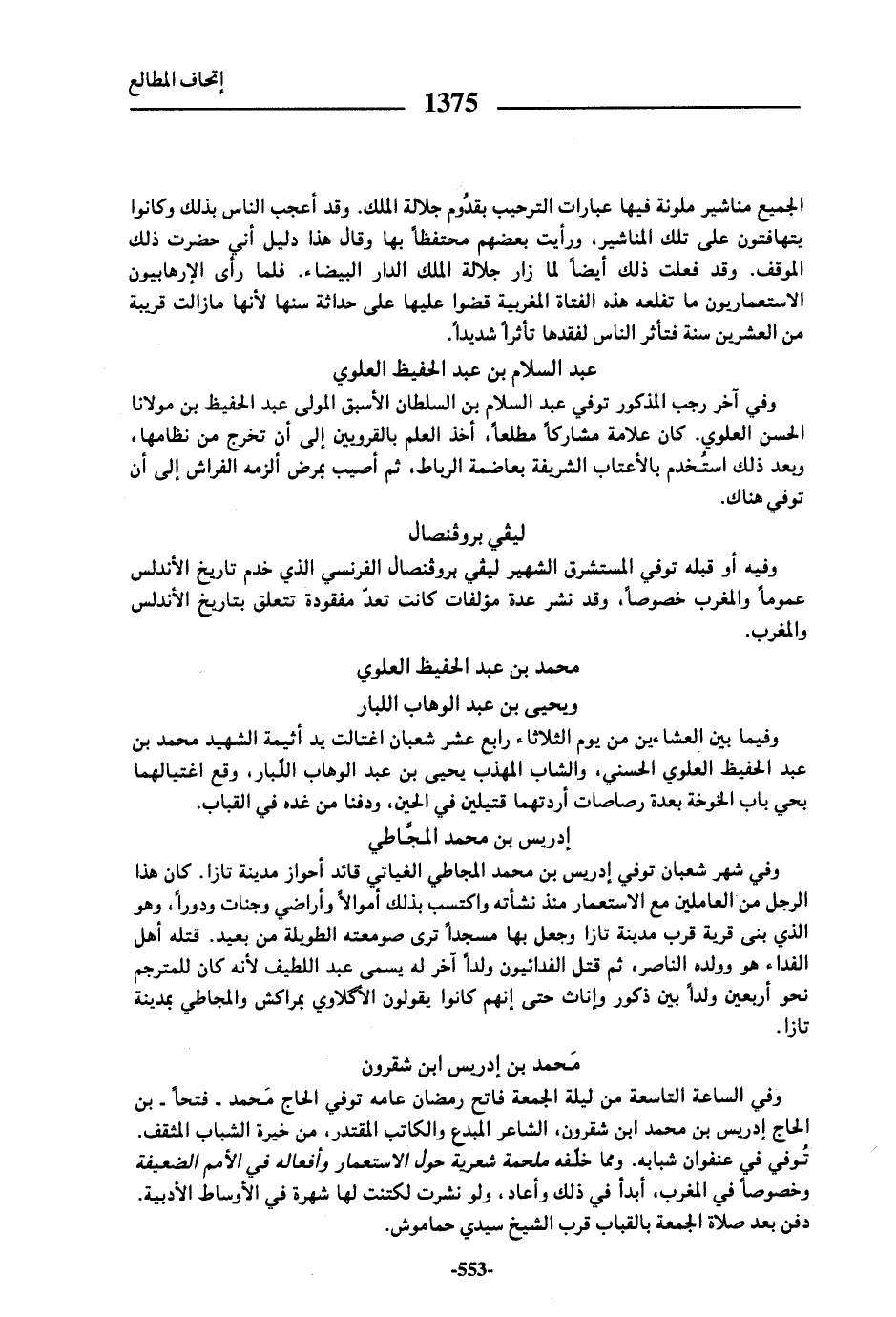 وفي آخر رجب المذكور توفي عبد السلام بن السلطان الأسبق المولى عبد الحفيظ بن مولانا الحسن العلوي. كان علامة مشاركا مطلعا، أخذ العلم بالقرويين إلى أن تخرج من نظامها، وبعد ذلك استخدم بالأعتاب الشريفة بعاضمة الرباط، ثم أصيب بمرض ألزمه الفراش إلى أن توفي هناك.
