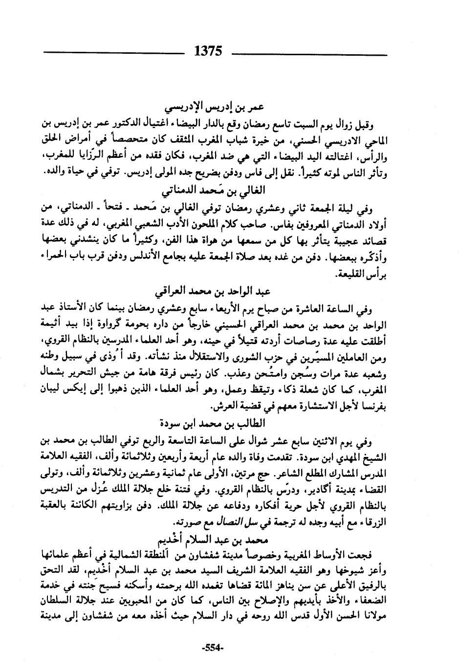 وفي يوم الاثنين سابع عشر شوال على الساعة التاسعة والربع توفي الطالب بن محمد بن الشيخ المهدي ابن سودة. تقدمت وفاة والده عام أربعة وأربعين وثلاثمائة وألف، الفقيه العلامة المدرس المشارك المطلع الشاعر. حج مرتين، الأولى عام ثمانية وعشرين وثلاثمائة وألف، وتولى القضاء بمدينة أكادير، ودرّس بالنظام القروي. وفي فتنة خلع جلالة الملك عزل من التدريس بالنظام القروي لأجل حرية أفكاره ودفاعه عن جلالة الملك. دفن بزاويتهم الكائنة بالعقبة الزرقاء مع أبيه وجده له ترجمة في سل النصال مع صورته.