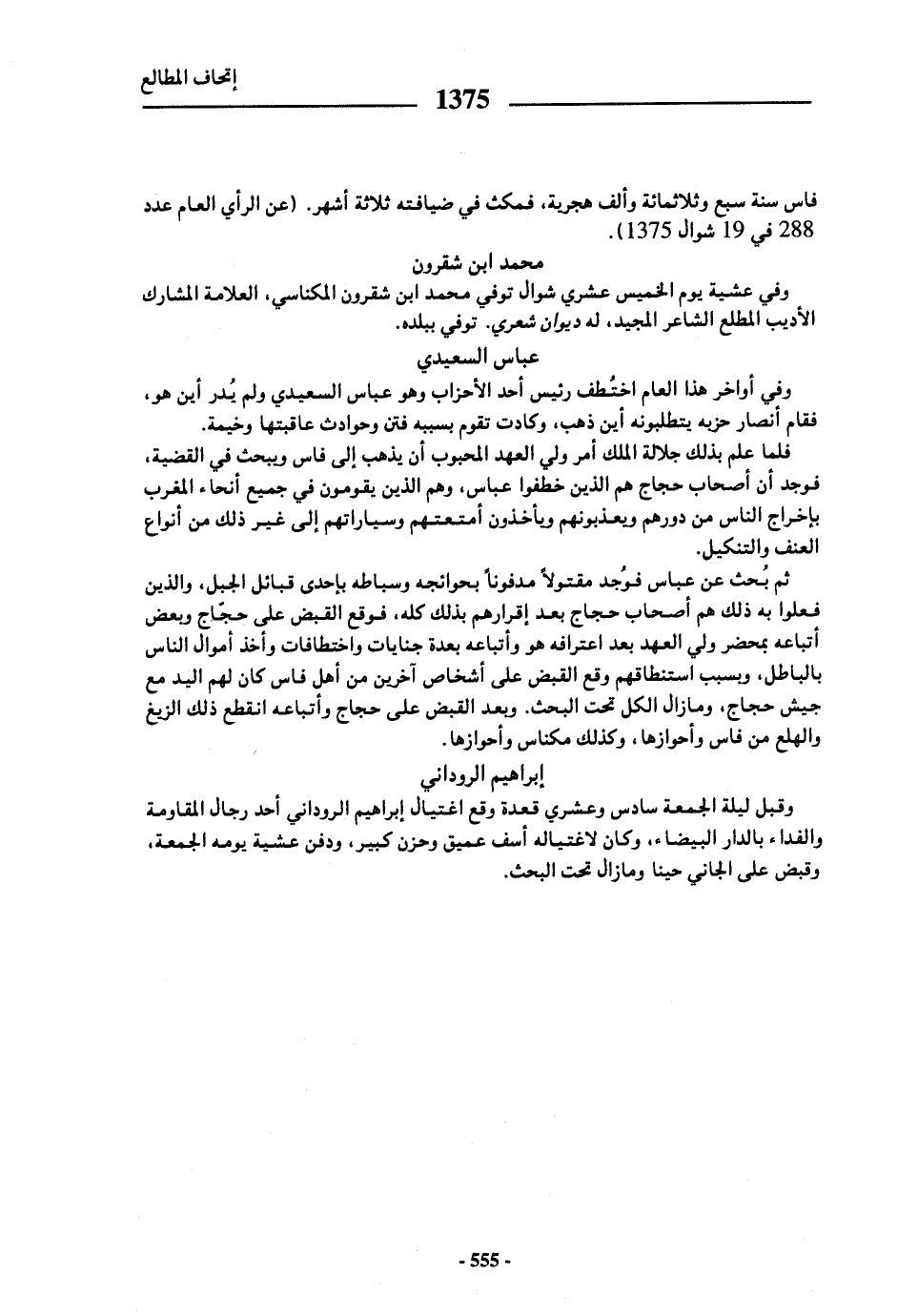 وقبل ليلة الجمعة سادس وعشري قعدة وقع اغتيال إبراهيم الروداني أحد رجال المقاومة والفداء بالدار البيضاء، وكان لاغتياله أسف عميق وحزن كبير، ودفن عشية يومه الجمعة، وقبض على الجاني حينا وما زال تحت البحث.