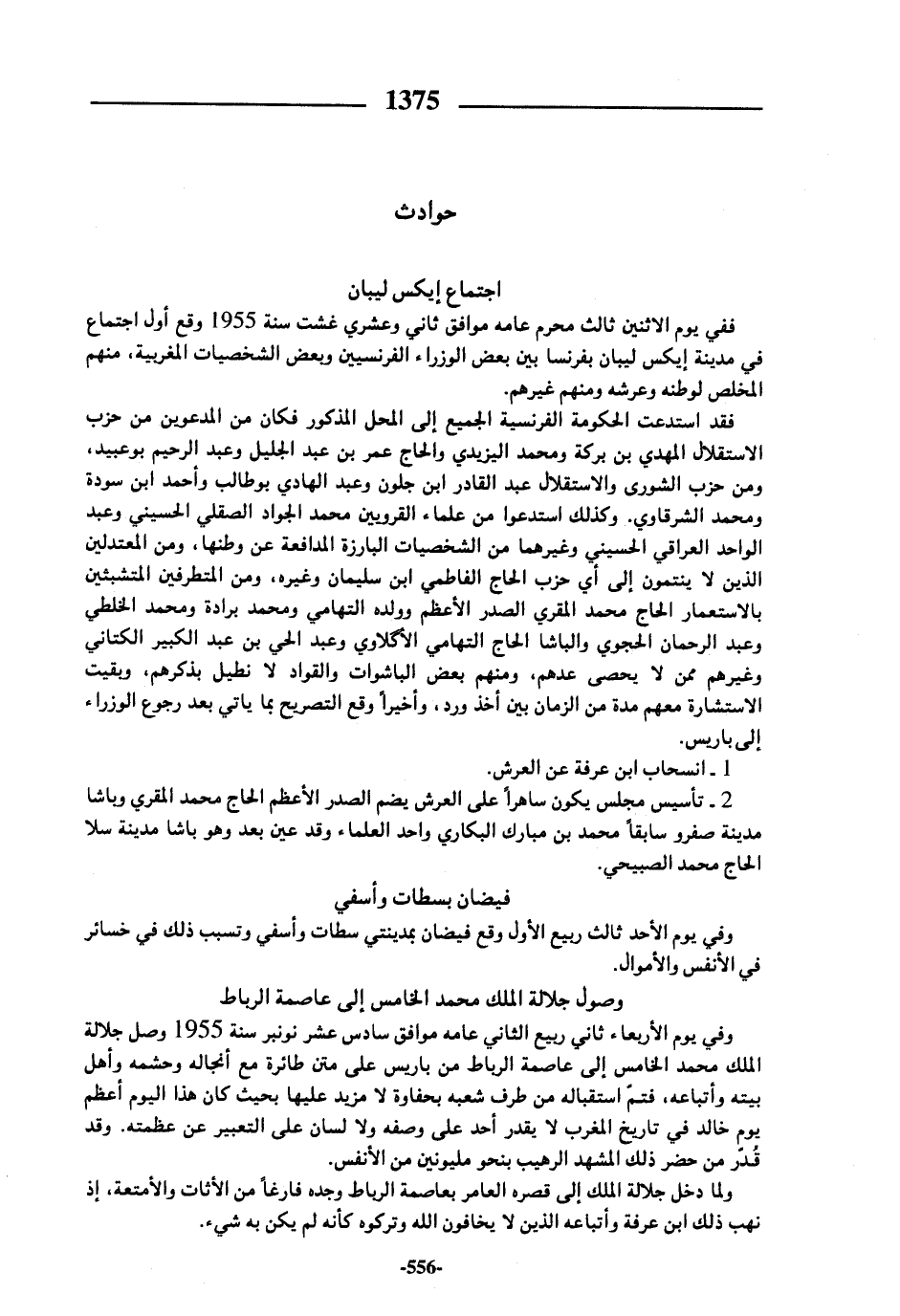 ففي يوم الاثنين ثالث محرم عامه موافق ثاني وعشري غشت سنة 1955 وقع أول اجتماع في مدينة إيكس ليبان بفرنسا بين بعض الوزراء الفرنسيين وبعض الشخصيات المغربية، منهم المخلص لوطنه وعرشه ومنهم غيرهم.