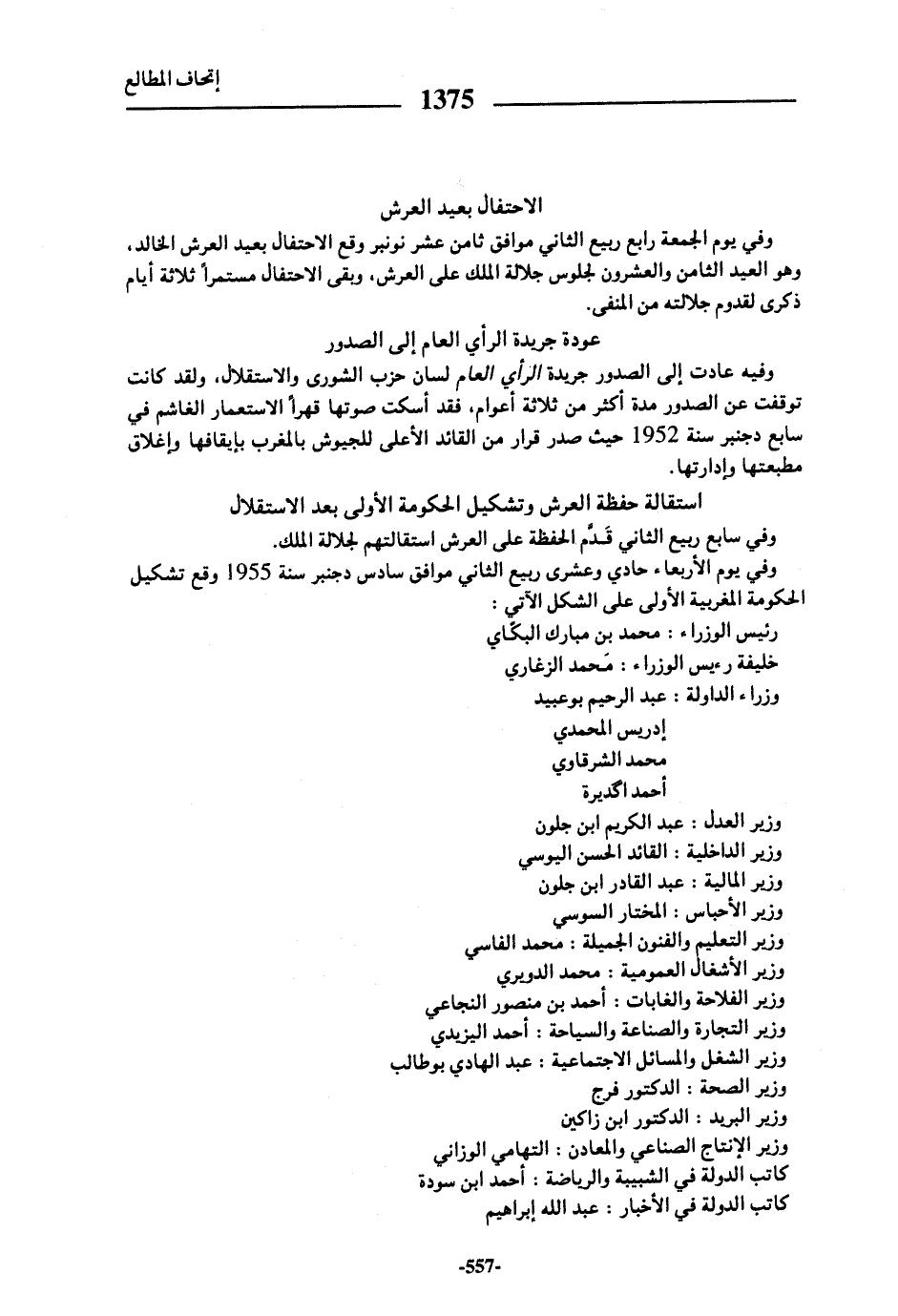 وفي يوم الأربعاء حادي وعشرى ربيع الثاني موافق سادس دجنبر سنة 1955 وقع تشكيل الحكومة المغربية الأولى على الشكل الآتي: