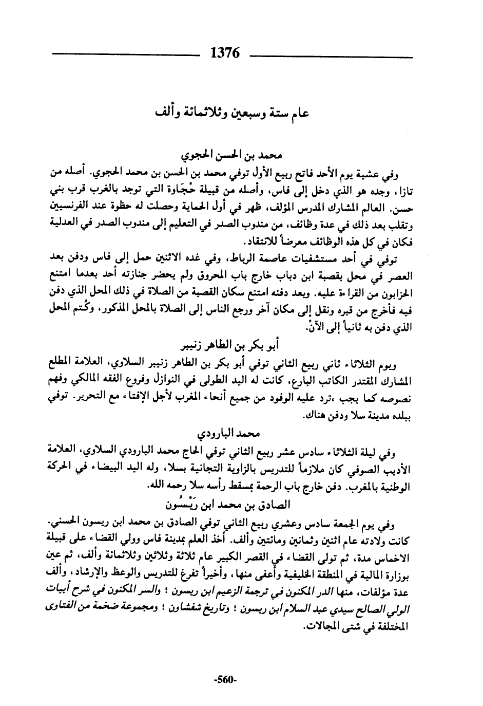 وفي ليلة الثلاثاء سادس عشر ربيع الثاني توفي الحاج محمد البارودي السلاوي، العلامة الأديب الصوفي كان ملازما للتدريس بالزاوية التجانية بسلا، وله اليد البيضاء في الحركة الوطنية بالمغرب. دفن خارج باب الرحمة بمسقط رأسه سلا رحمه الله.
