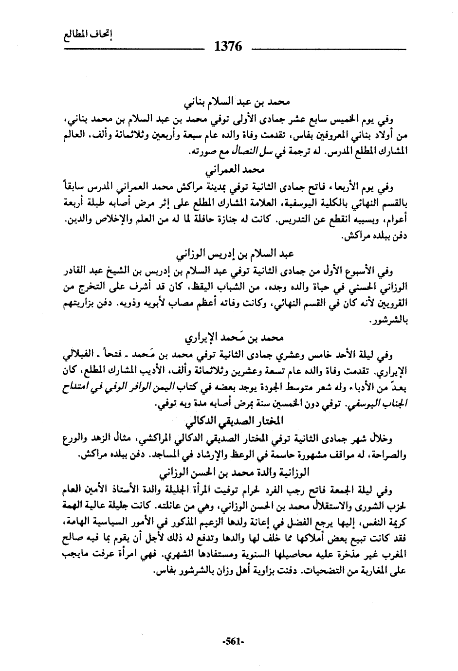 وفي يوم الخميس سابع عشر جمادى الأولى توفي محمد بن عبد السلام بن محمد بناني، من أولاد بناني المعروفين بفاس، تقدمت وفاة والده عام سبعة وأربعين وثلاثمائة وألف، العالم المشارك المطلع المدرس. له ترجمة في سل النصال مع صورته.