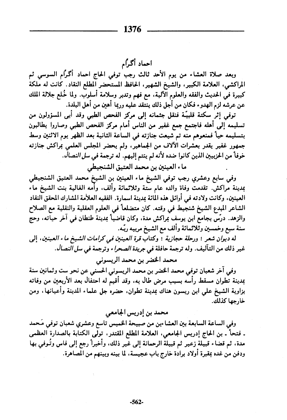 وبعد صلاة العشاء من يوم الأحد ثالث رجب توفي الحاج احماد أكرّام السوسي ثم المراكشي، العلامة الكبير، والشيخ الشهير، الحافظ المستحضر المطلع النقاد. كانت له ملكة كبيرة في الحديث والفقه والعلوم الآلية، مع فهم وتدبر وسلامة أسلوب. ولما خلع جلالة الملك عن عرشه لزم الهدوء فكان من أجل ذلك ينتقد عليه وربما أهين من أهل البلدة.