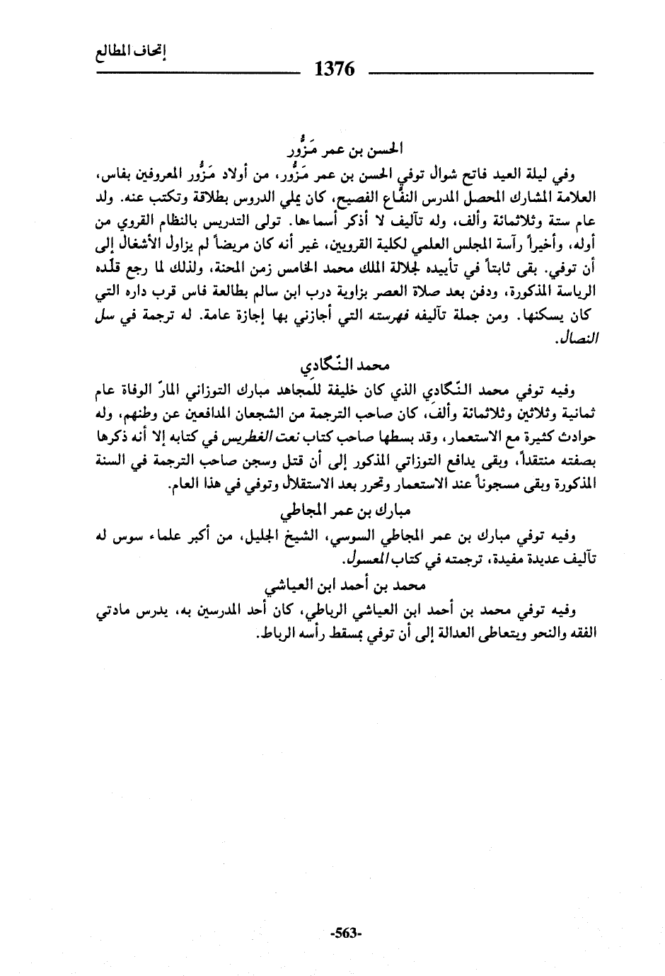 وفي ليلة العيد فاتح شوال توفي الحسن بن عمر مزّور، من أولاد مزّور المعروفين بفاس، العلامة المشارك المحصل المدرس النفّاع الفصيح، كان يملي الدروس بطلاقة وتكتب عنه. ولد عام ستة وثلاثمائة وألف، وله تآليف لا أذكر أسماءها. تولى التدريس بالنظام القروي من أوله، وأخيرا رآسة المجلس العلمي لكلية القرويين، غير أنه كان مريضا لم يزاول الأشغال إلى أن توفي. بقى ثابتا في تأييده لجلالة الملك محمد الخامس زمن المحنة، ولذلك لما رجع قلّده الرياسة المذكورة، ودفن بعد صلاة العصر بزاوية درب ابن سالم بطالعة فاس قرب داره التي كان يسكنها. ومن جملة تآليفه فهرسته التي أجازني بها إجازة عامة. له ترجمة في سل النصال.