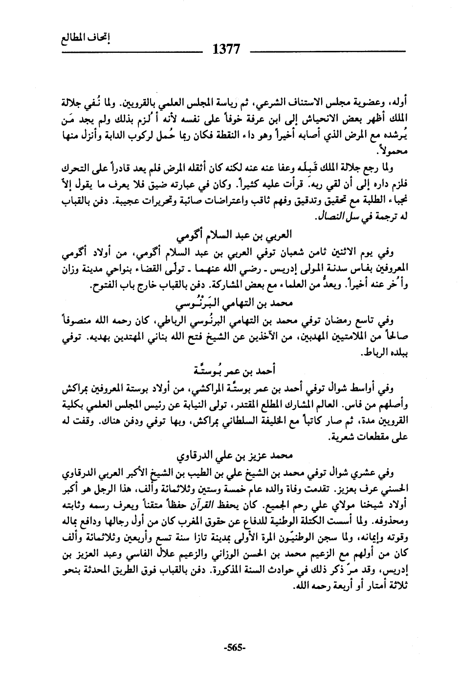 ولما رجع جلالة الملك قبله وعفا عنه عنه لكنه كان أثقله المرض فلم يعد قادرا على التحرك فلزم داره إلى أن لقي ربه. قرأت عليه كثيرا. وكان في عبارته ضيق فلا يعرف ما يقول إلاّ نجباء الطلبة مع تحقيق وتدقيق وفهم ثاقب واعتراضات صائبة وتحريرات عجيبة. دفن بالقباب له ترجمة في سل النصال.