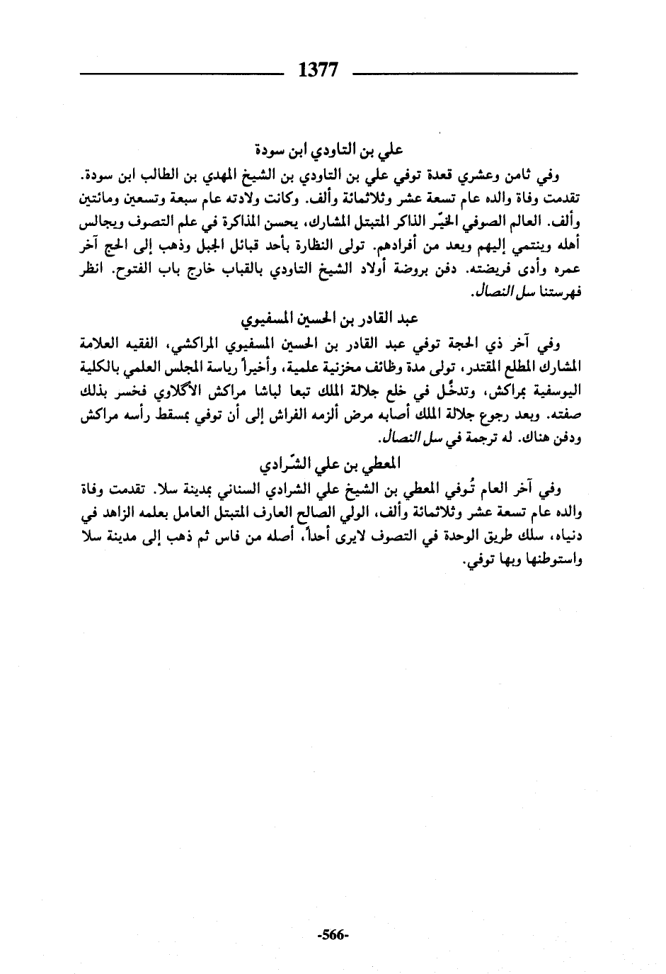 وفي آخر العام توفي المعطي بن الشيخ علي الشرادي السناني بمدينة سلا. تقدمت وفاة والده عام تسعة عشر وثلاثمائة وألف، الولي الصالح العارف المتبتل العامل بعلمه الزاهد في دنياه، سلك طريق الوحدة في التصوف لا يرى أحدا، أصله من فاس ثم ذهب إلى مدينة سلا واستوطنها وبها توفي.