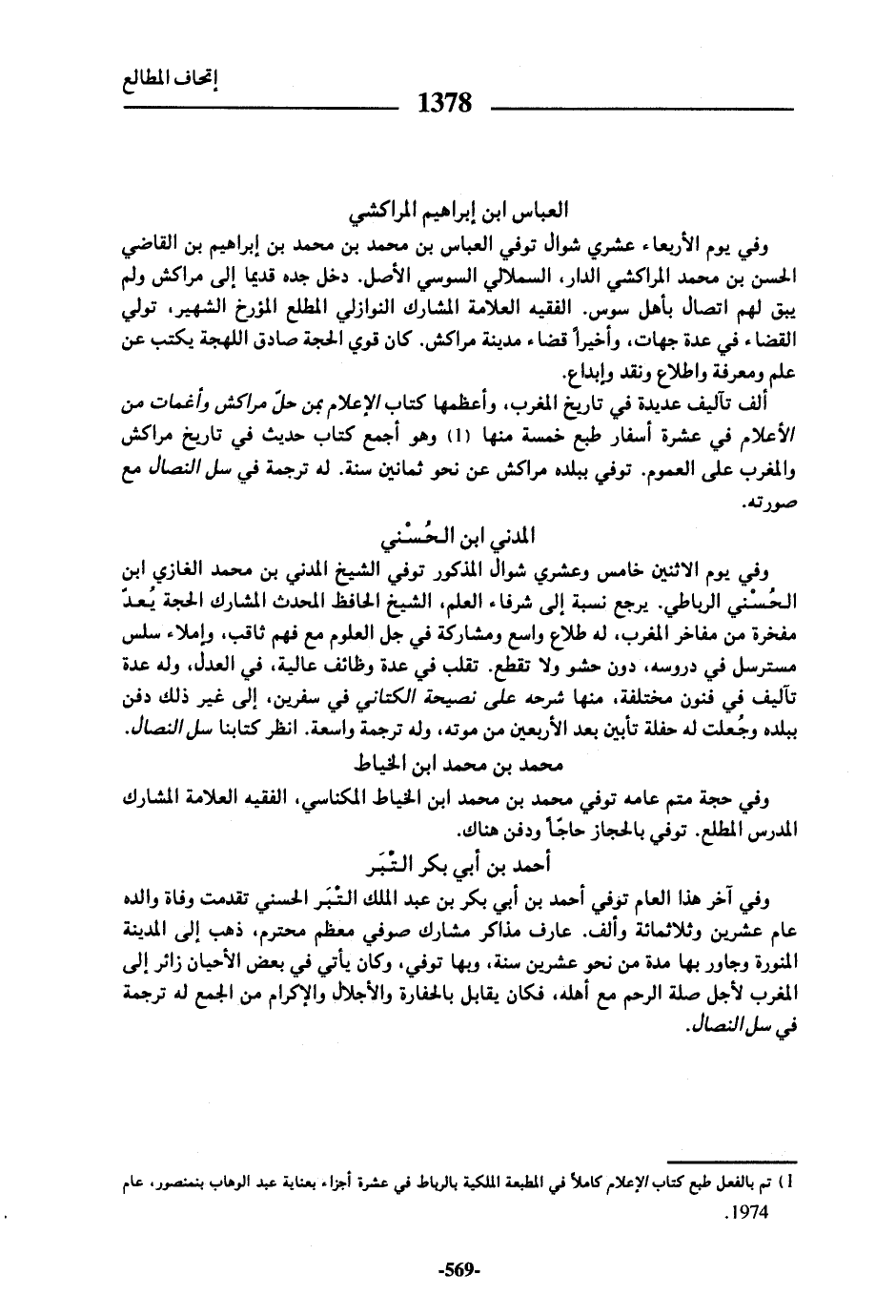 (¬1) تم بالفعل طبع كتاب الإعلام كاملا في المطبعة الملكية بالرباط في عشرة أجزاء بعناية عبد الوهاب بنمنصور، عام 1974.