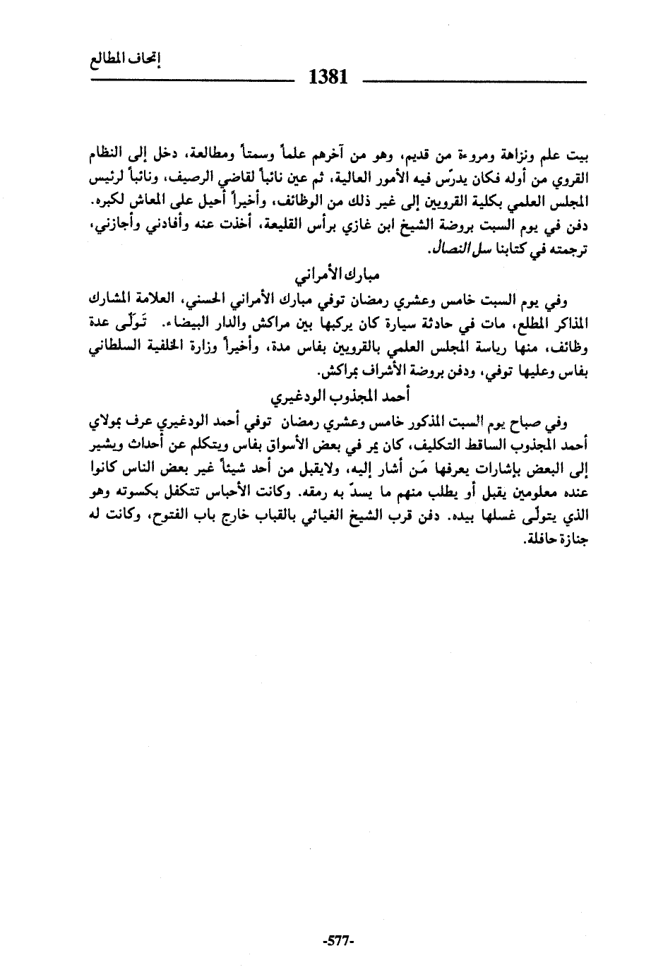 وفي يوم السبت خامس وعشري رمضان توفي مبارك الأمراني الحسني، العلامة المشارك المذاكر المطلع، مات في حادثة سيارة كان يركبها بين مراكش والدار البيضاء. تولّى عدة وظائف، منها رياسة المجلس العلمي بالقرويين بفاس مدة، وأخيرا وزارة الخلفية السلطاني بفاس وعليها توفي، ودفن بروضة الأشراف بمراكش.