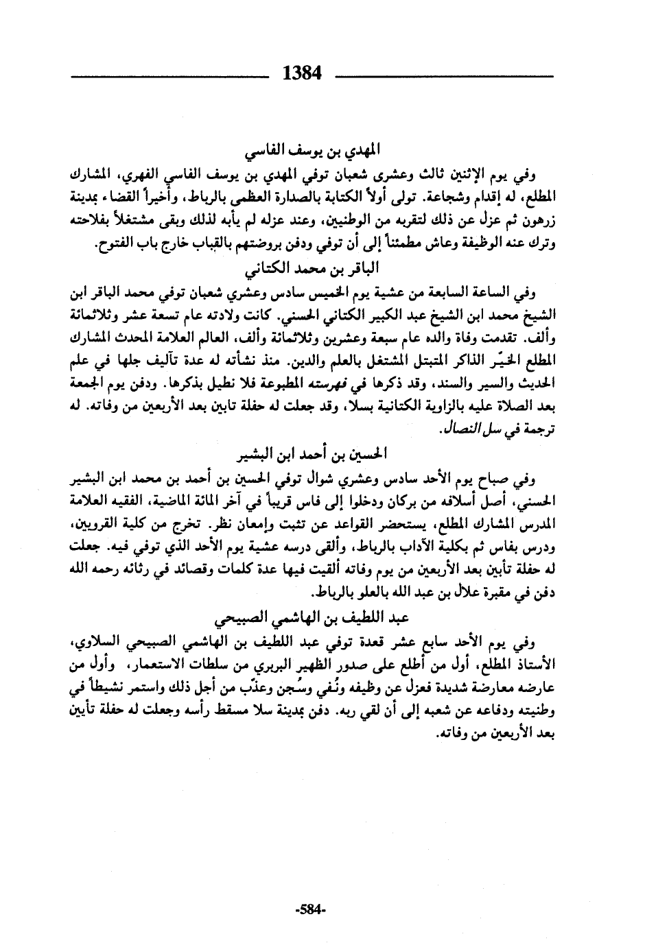 وفي يوم الإثنين ثالث وعشرى شعبان توفي المهدي بن يوسف الفاسي الفهري، المشارك المطلع، له إقدام وشجاعة. تولى أولا الكتابة بالصدارة العظمى بالرباط، وأخيرا القضاء بمدينة زرهون ثم عزل عن ذلك لتقربه من الوطنيين، وعند عزله لم يأبه لذلك وبقى مشتغلا بفلاحته وترك عنه الوظيفة وعاش مطمئنا إلى أن توفي ودفن بروضتهم بالقباب خارج باب الفتوح.