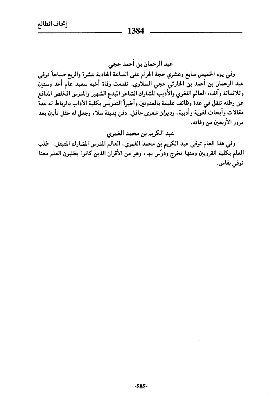 وفي يوم الخميس سابع وعشري حجة الحرام على الساعة الحادية عشرة والربع صباحا توفي عبد الرحمان بن أحمد بن الحارثي حجي السلاوي. تقدمت وفاة أخيه سعيد عام أحد وستين وثلاثمائة وألف، العالم اللغوي والأديب المشارك الشاعر المبدع الشهير والمدرس المخلص المدافع عن وطنه تنقل في عدة وظائف عليمة بالعدوتين وأخيرا التدريس بكلية الآداب بالرباط له عدة مقالات وأبحاث لغوية وأدبية، وديوان شعري حافل. دفن بمدينة سلا، وجعل له حفل تأبين بعد مرور الأربعين من وفاته.