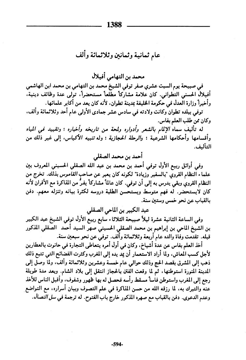 في صبيحة يوم السبت عشري صفر توفي الشيخ محمد بن التهامي بن محمد ابن الهاشمي أفيلال الحسني التطواني. كان علامة مشاركا مطلعا مستحضرا، تولى عدة وظائف دينية، وأخيرا وزارة العدل في حكومة الخليفة بمدينة تطوان، لأنه كان يعد من أكابر علمائها.