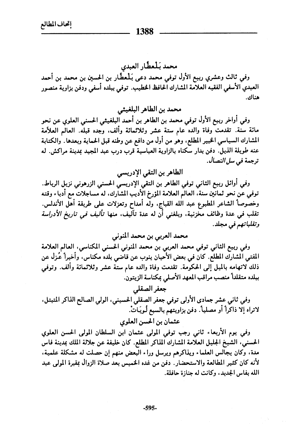 وفي أواخر ربيع الأول توفي محمد بن الطاهر بن أحمد البلغيثي الحسني العلوي عن نحو مائة سنة. تقدمت وفاة والده عام ستة عشر وثلاثمائة وألف، وجده قبله. العالم العلاّمة المشارك السياسي الخبير المطلع، وهو من أول من دافع عن وطنه قبل الحماية وبعدها. والكتابة عنه طويلة الذيل. دفن بدار سكناه بالزاوية العباسية قرب درب عبد المجيد بمدينة مراكش. له ترجمة في سل النصال.