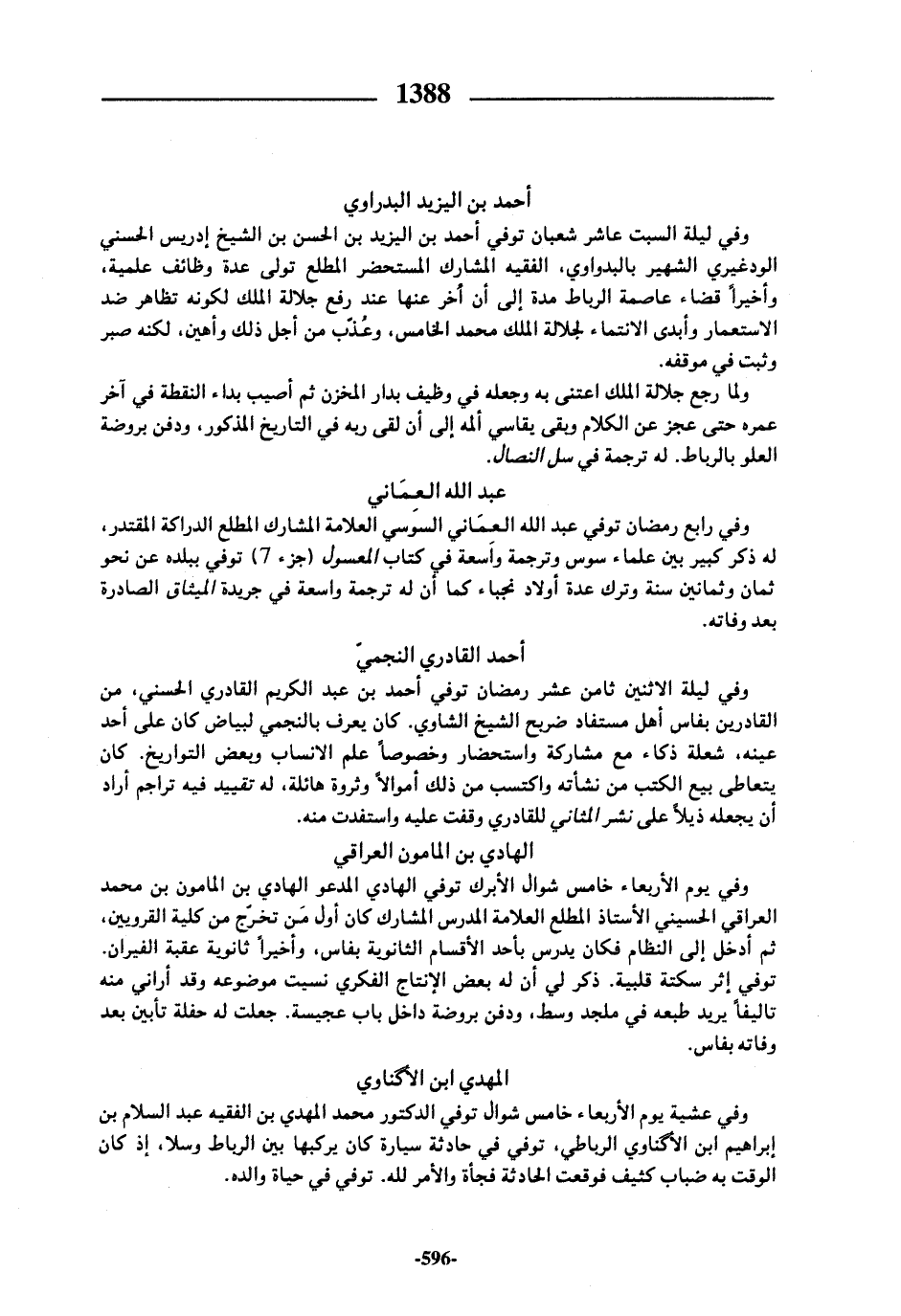 وفي يوم الأربعاء خامس شوال الأبرك توفي الهادي المدعو الهادي بن المامون بن محمد العراقي الحسيني الأستاذ المطلع العلامة المدرس المشارك كان أول من تخرّج من كلية القرويين، ثم أدخل إلى النظام فكان يدرس بأحد الأقسام الثانوية بفاس، وأخيرا ثانوية عقبة الفيران.