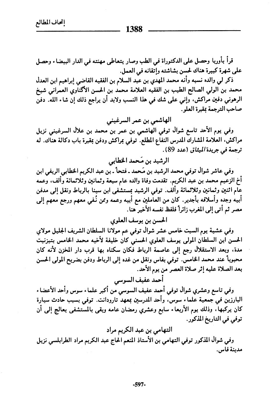 وفي عاشر شوال توفي محمد الرشيد بن محمد-فتحا-بن عبد الكريم الخطابي الريفي ابن أخ الزعيم محمد بن عبد الكريم. تقدمت وفاة والده عام سبعة وثمانين وثلاثمائة وألف، وعمه عام اثنين وثمانين وثلاثمائة وألف. توفي الرشيد بمستشفى ابن سينا بالرباط ونقل إلى مدفن أبيه وجده وأسلافه بأجدير. كان من العاملين مع أبيه وعمه وممن نفي معهم ورجع معهم إلى مصر ثم أتى إلى المغرب زائرا فلفظ نفسه الأخير هنا.