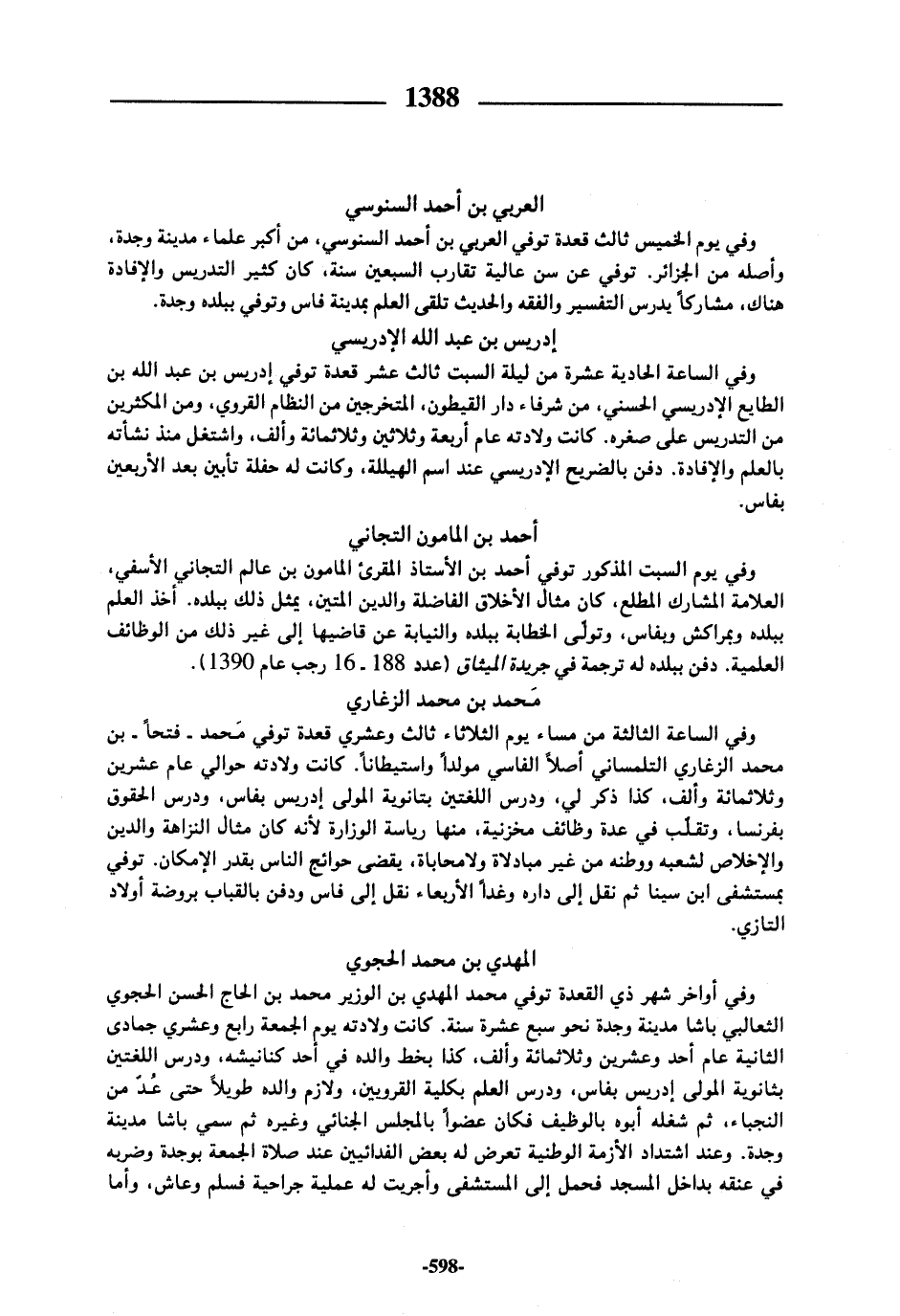 وفي يوم الخميس ثالث قعدة توفي العربي بن أحمد السنوسي، من أكبر علماء مدينة وجدة، وأصله من الجزائر. توفي عن سن عالية تقارب السبعين سنة، كان كثير التدريس والإفادة هناك، مشاركا يدرس التفسير والفقه والحديث تلقى العلم بمدينة فاس وتوفي ببلده وجدة.
