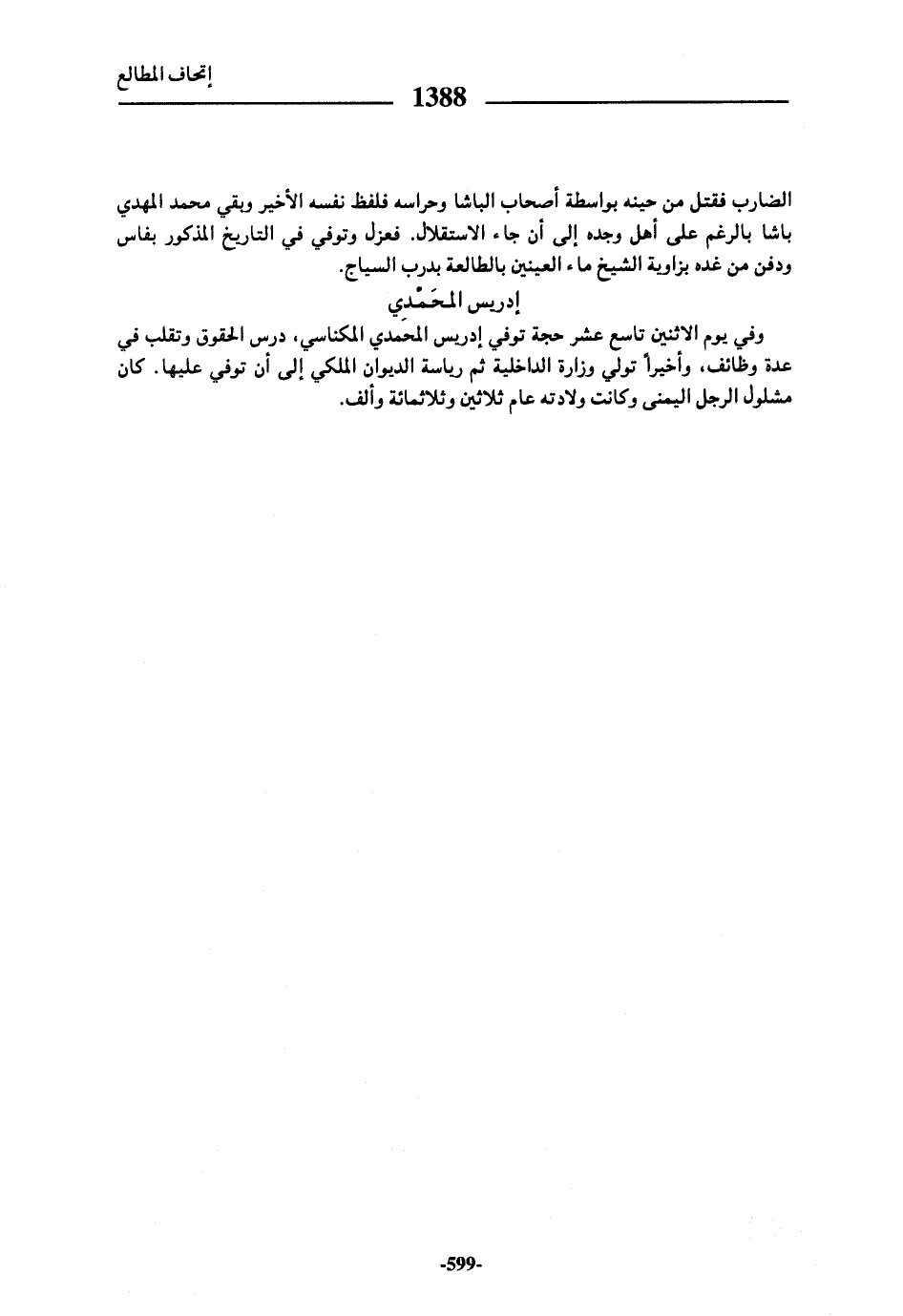 وفي يوم الاثنين تاسع عشر حجة توفي إدريس المحمدي المكناسي، درس الحقوق وتقلب في عدة وظائف، وأخيرا تولي وزارة الداخلية ثم رياسة الديوان الملكي إلى أن توفي عليها. كان مشلول الرجل اليمنى وكانت ولادته عام ثلاثين وثلاثمائة وألف.