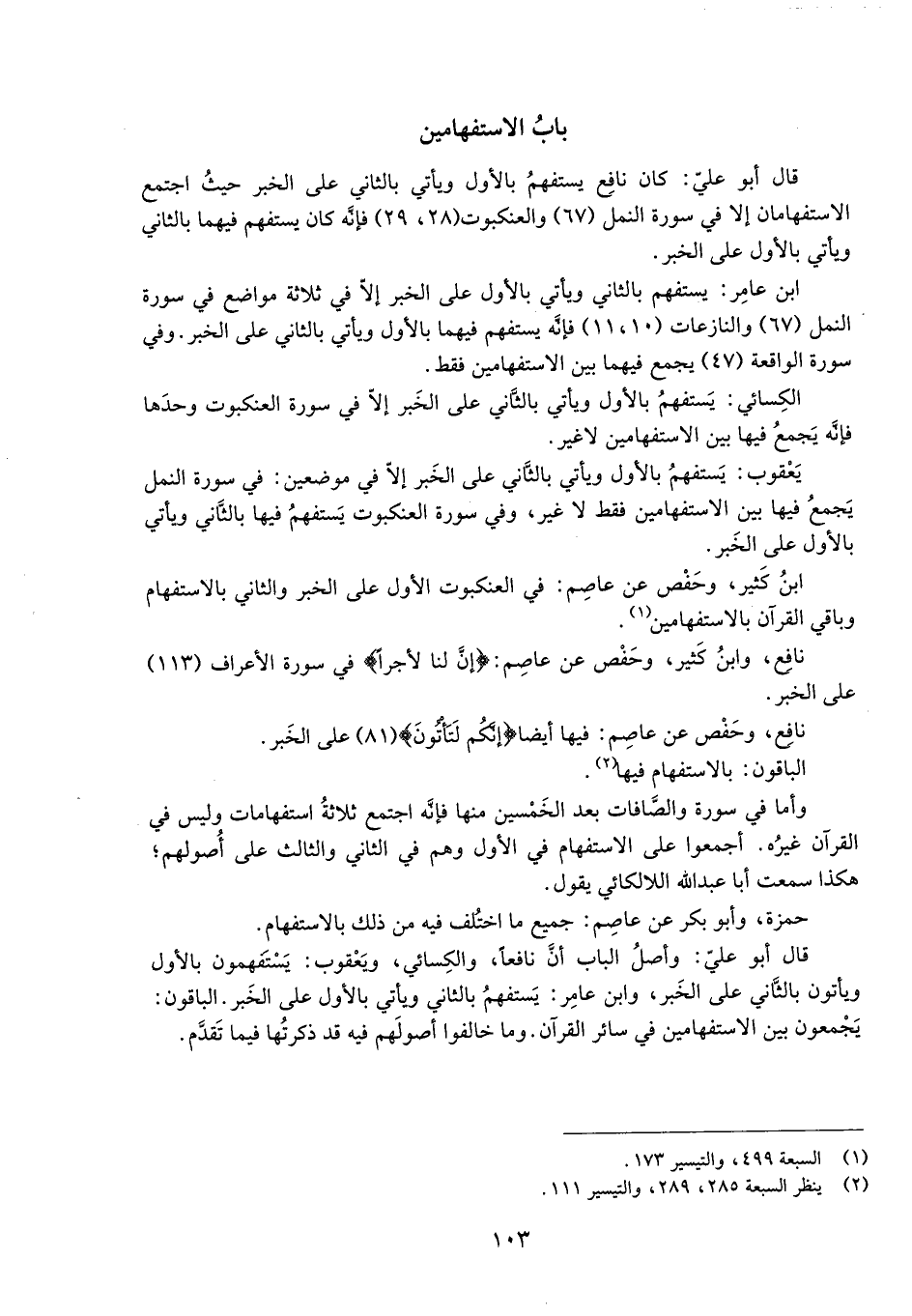 وأما في سورة والصّافات بعد الخمسين منها فإنّه اجتمع ثلاثة استفهامات وليس في القرآن غيره. أجمعوا على الاستفهام في الأول وهم في الثاني والثالث على أصولهم؛ هكذا سمعت أبا عبد الله اللالكائي يقول.