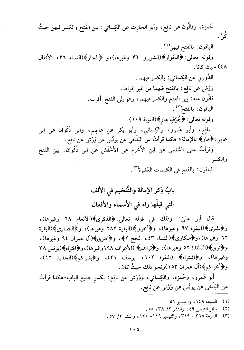(3) السبعة 318 - 319، والتيسير 119 - 120، والنشر 2/ 57.