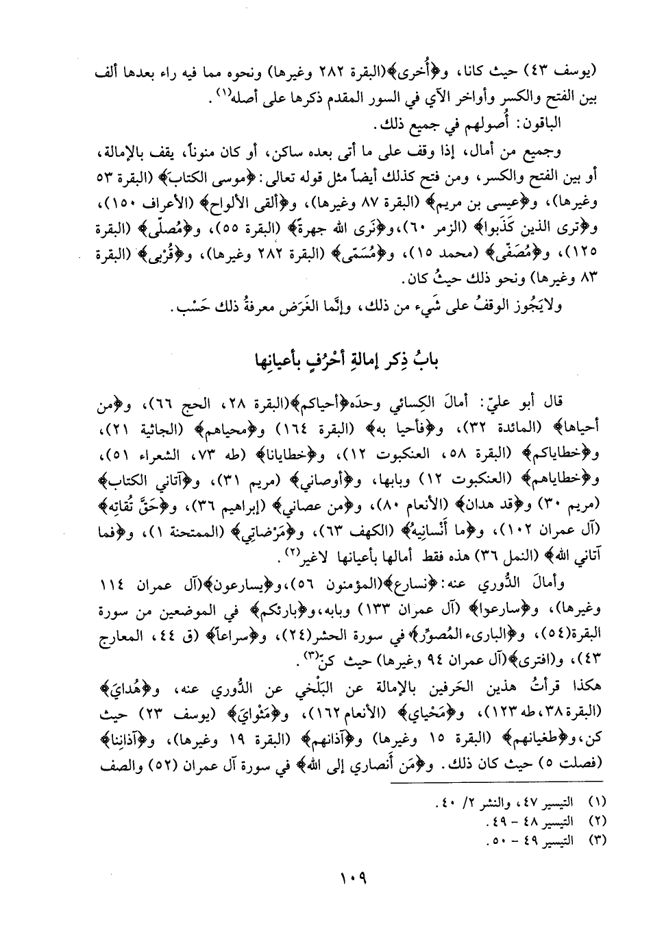 هكذا قرأت هذين الحرفين بالإمالة عن البلخي عن الدّوري عنه، وهُدايَ* (البقرة 38، طه 123)، ومَحْيايَ (الأنعام 162)، ومَثْوايَ (يوسف 23) حيث كن، وطُغْيانِهِمْ* (البقرة 15 وغيرها) وآذانِهِمْ* (البقرة 19 وغيرها)، وآذانِنا (فصلت 5) حيث كان ذلك. ومَنْ أَنْصارِي إِلَى اللَّهِ* في سورة آل عمران (52) والصف