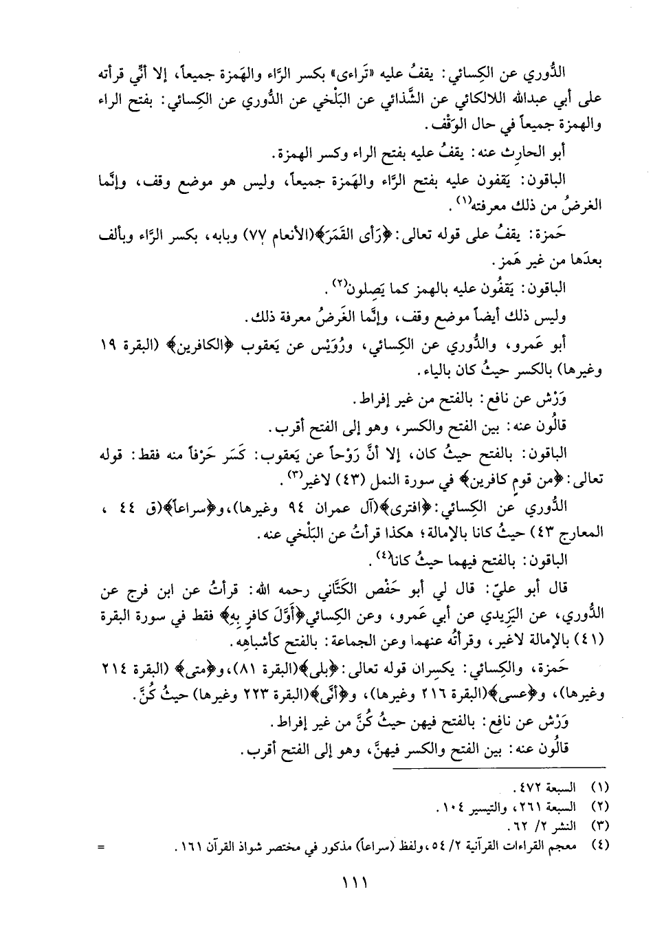 الباقون: يقفون عليه بفتح الرّاء والهمزة جميعا، وليس هو موضع وقف، وإنّما الغرض من ذلك معرفته «1».
