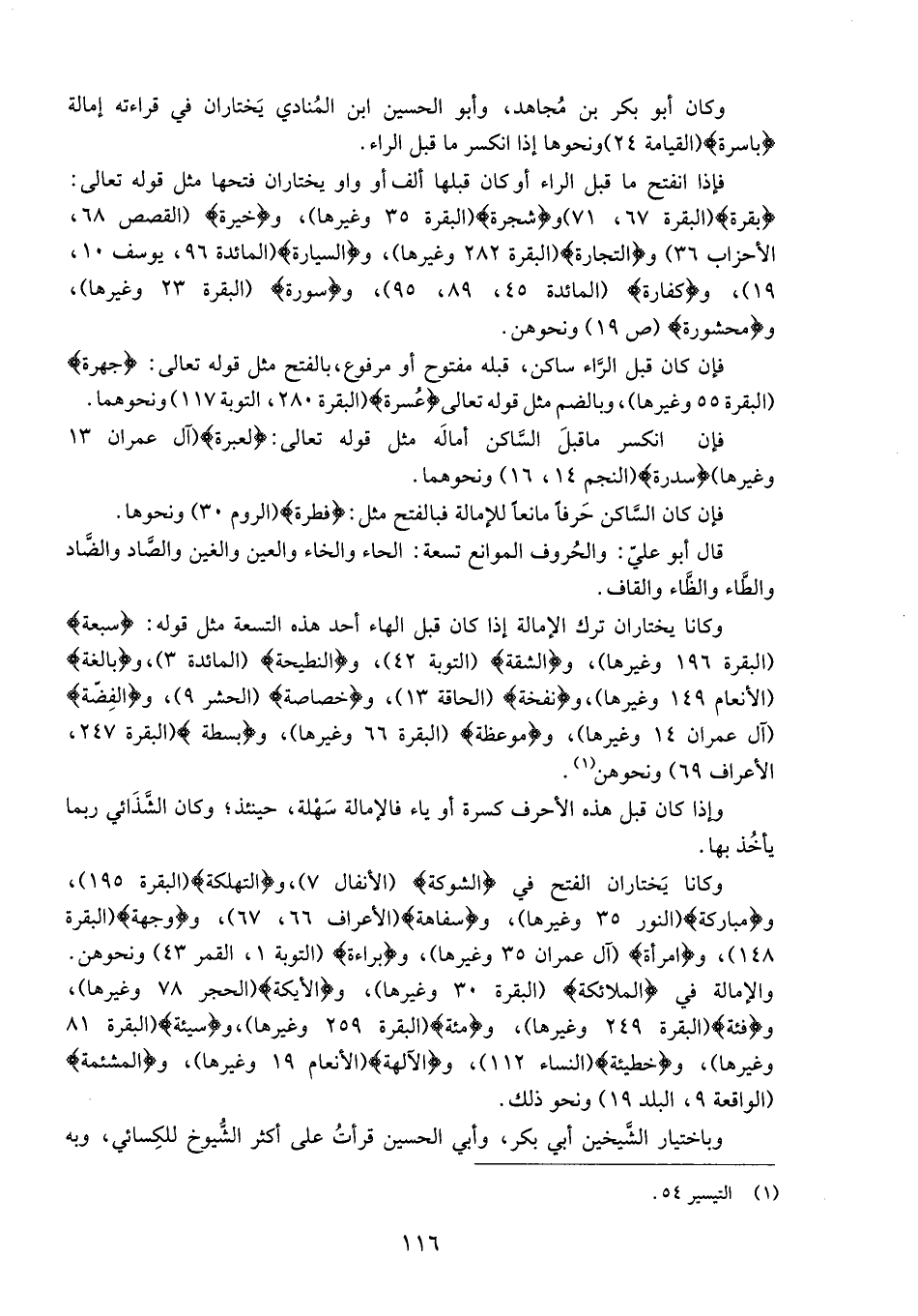 وكان أبو بكر بن مجاهد، وأبو الحسين ابن المنادي يختاران في قراءته إمالة باسِرَةٌ (القيامة 24) ونحوها إذا انكسر ما قبل الراء.