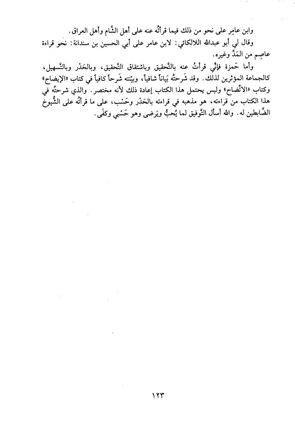 وأما حمزة فإنّي قرأت عنه بالتّحقيق وباشتقاق التّحقيق، وبالحدر وبالتّسهيل، كالجماعة المؤثرين لذلك. وقد شرحته بيانا شافيا، وبيّنته شرحا كافيا في كتاب «الإيضاح» وكتاب «الاتّضاح» وليس يحتمل هذا الكتاب إعادة ذلك لأنه مختصر. والذي شرحته في هذا الكتاب من قراءته، هو مذهبه في قراءته بالحدر وحسب، على ما قرأته على الشّيوخ الضّابطين له. والله أسأل التّوفيق لما يحبّ ويرضى وهو حسبي وكفى.
