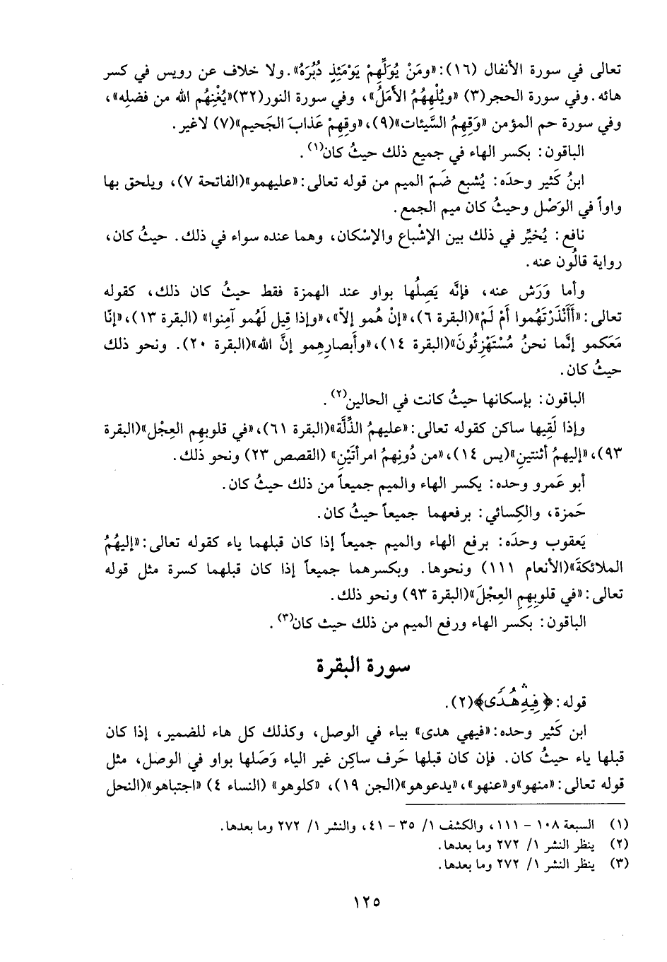 (1) السبعة 108 - 111، والكشف 1/ 35 - 41، والنشر 1/ 272 وما بعدها.