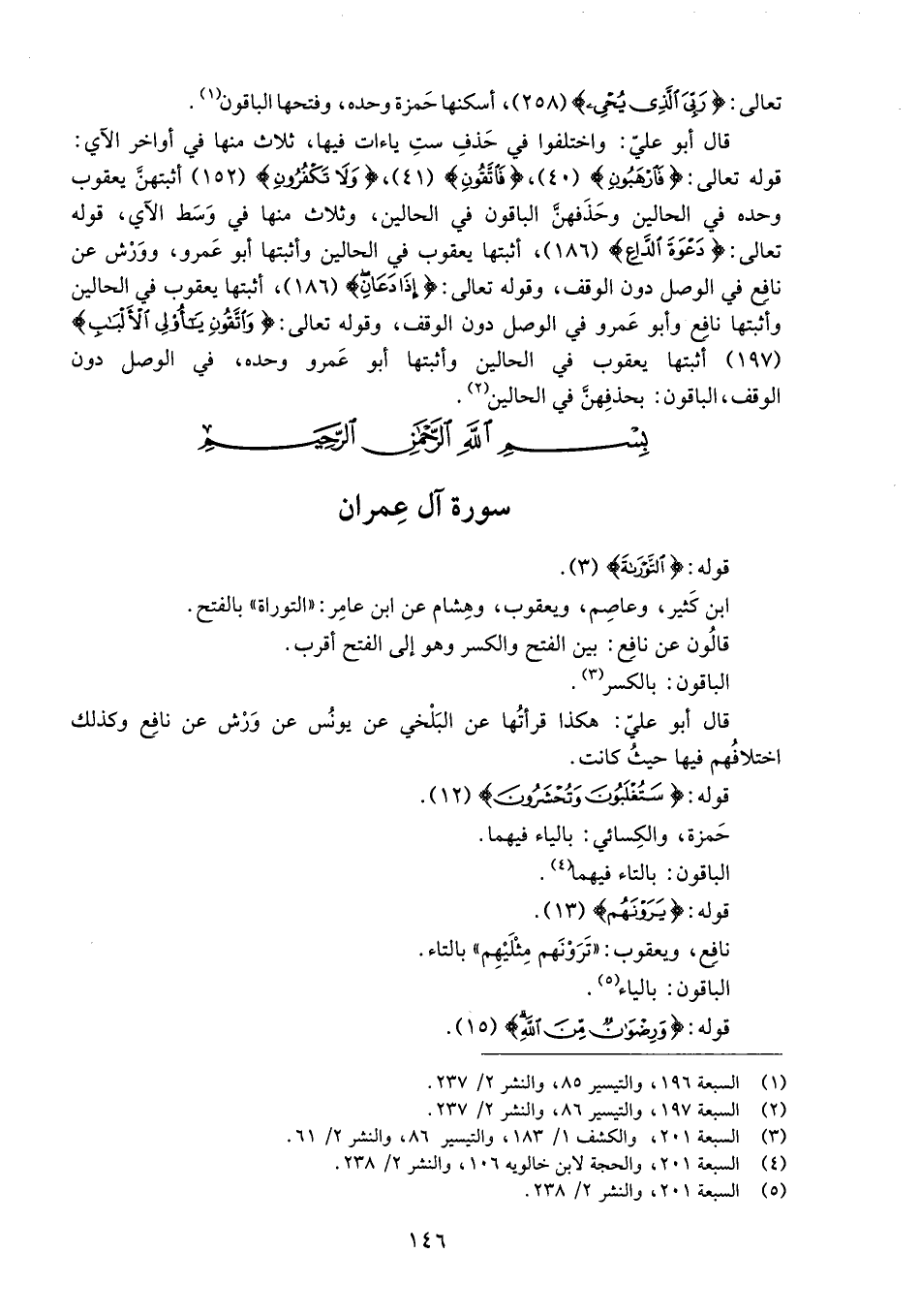 (3) السبعة 201، والكشف 1/ 183، والتيسير 86، والنشر 2/ 61.