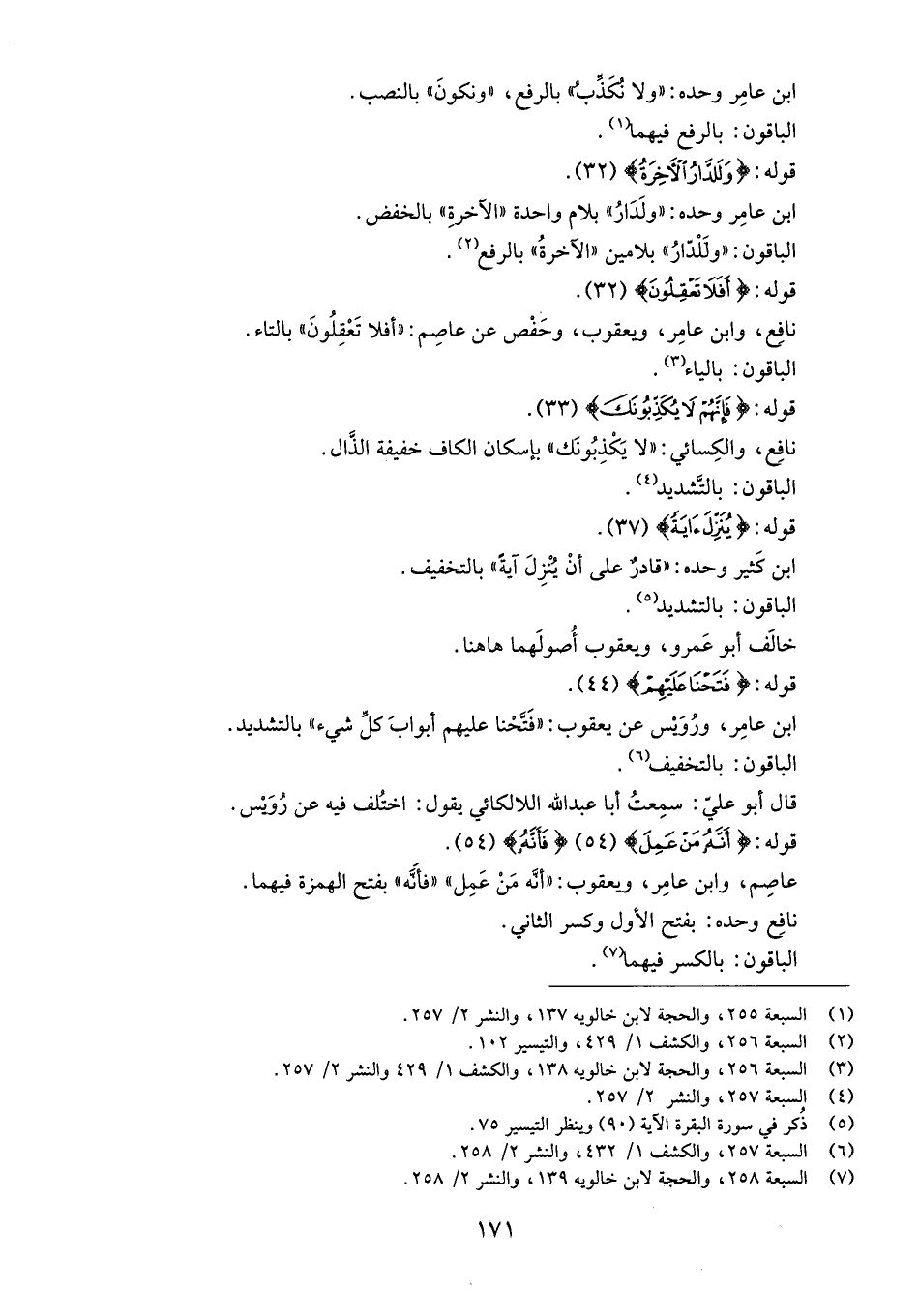 (7) السبعة 258، والحجة لابن خالويه 139، والنشر 2/ 258.