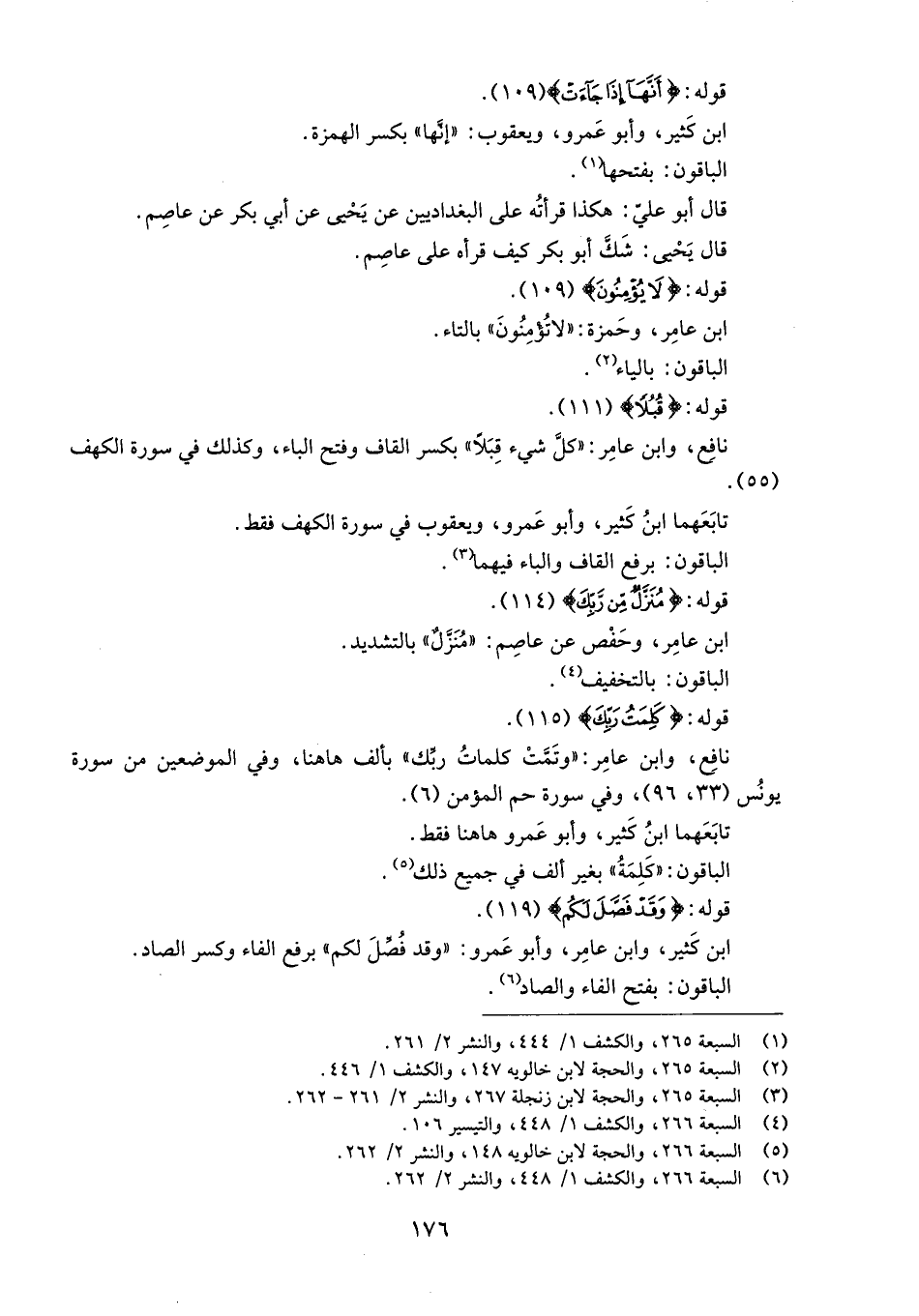 (2) السبعة 265، والحجة لابن خالويه 147، والكشف 1/ 446.