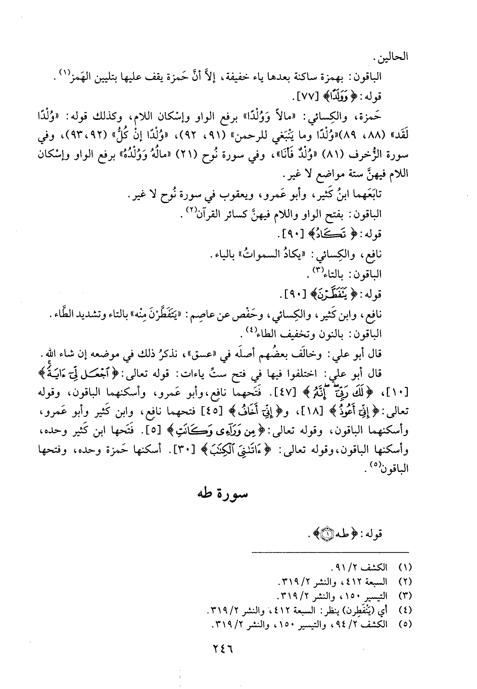 حمزة، والكسائي: «مالا وولدا» برفع الواو وإسكان اللام، وكذلك قوله: «ولدا لقد» (88، 89) «ولدا وما ينبغي للرحمن» (91، 92)، «ولدا إن كلّ» (92، 93)، وفي سورة الزّخرف (81) «ولد فأنا»، وفي سورة نوح (21) «ماله وولده» برفع الواو وإسكان اللام فيهنّ ستة مواضع لا غير.