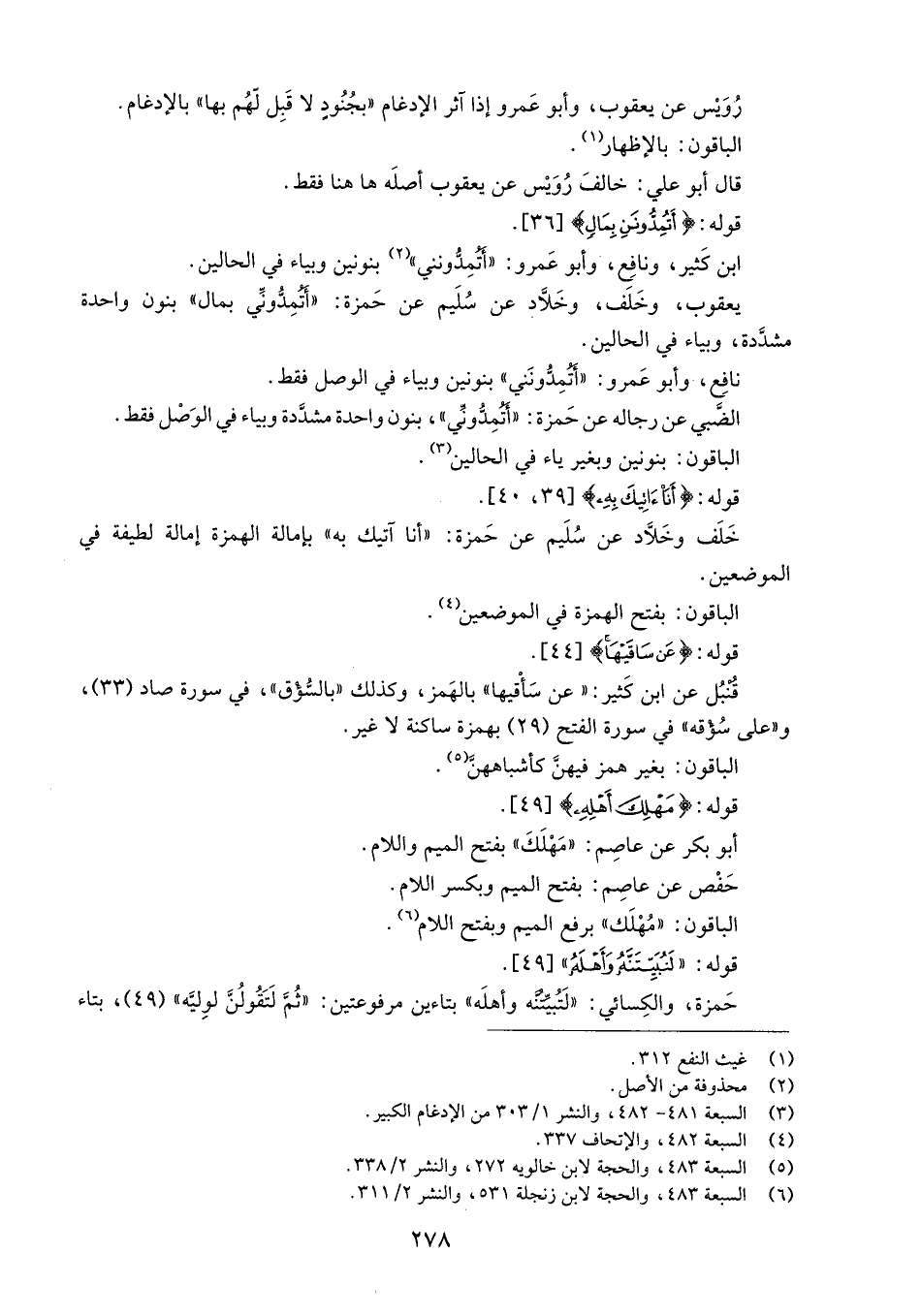 الضّبي عن رجاله عن حمزة: «أتمدّونّي»، بنون واحدة مشدّدة وبياء في الوصل فقط.