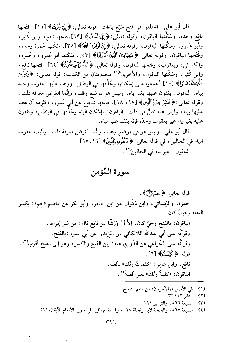 قال أبو علي: اختلفوا في فتح سبع ياءات: قوله تعالى: إِنِّي أُمِرْتُ [11]. فتحها نافع وحده، وسكّنها الباقون، وقوله تعالى: إِنِّي أَخافُ [13]. فتحها نافع، وابن كثير، وأبو عمرو، وسكّنها الباقون، وقوله تعالى: إِنْ أَرادَنِيَ اللَّهُ [38]. سكّنها حمزة وحده، وفتحها الباقون، وقوله تعالى: يا عِبادِيَ الَّذِينَ أَسْرَفُوا [53]. سكّنها أبو عمرو، وحمزة، والكسائي، ويعقوب، وفتحها الباقون، وقوله تعالى: تَأْمُرُونِّي أَعْبُدُ [64]. فتحها نافع، وابن كثير، وسكّنها الباقون، والأخريان «1» محذوفتان من الكتاب: قوله تعالى: يا عِبادِ الَّذِينَ آمَنُوا [10] أجمعوا على إسكانها وحذفها في الوصل. ووقف عليها يعقوب وحده بياء. الباقون: يقفون عليها بغير ياء، وليس هو موضع وقف، وإنّما الغرض معرفة ذلك.