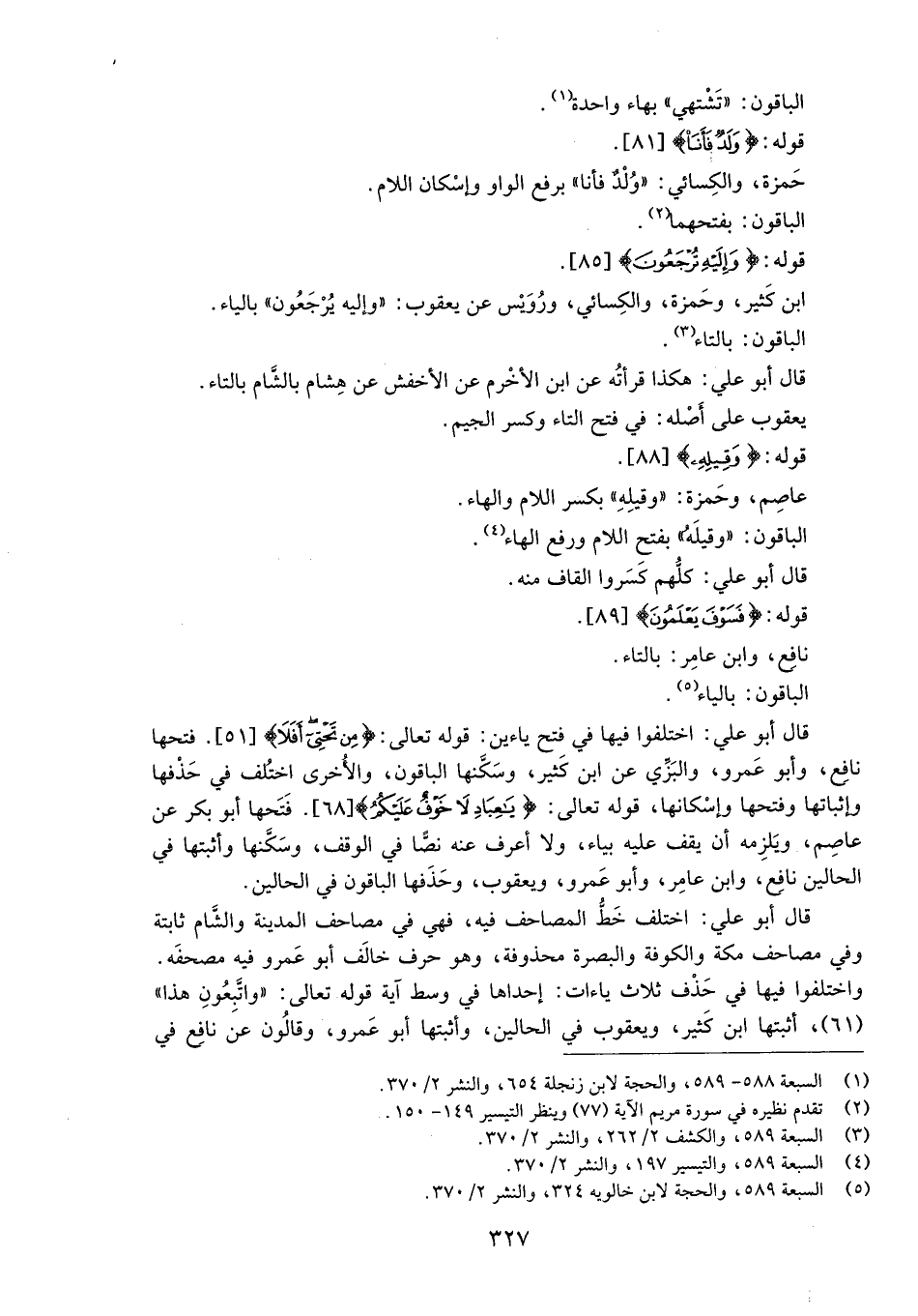 قال أبو علي: اختلف خطّ المصاحف فيه، فهي في مصاحف المدينة والشّام ثابتة وفي مصاحف مكة والكوفة والبصرة محذوفة، وهو حرف خالف أبو عمرو فيه مصحفه.