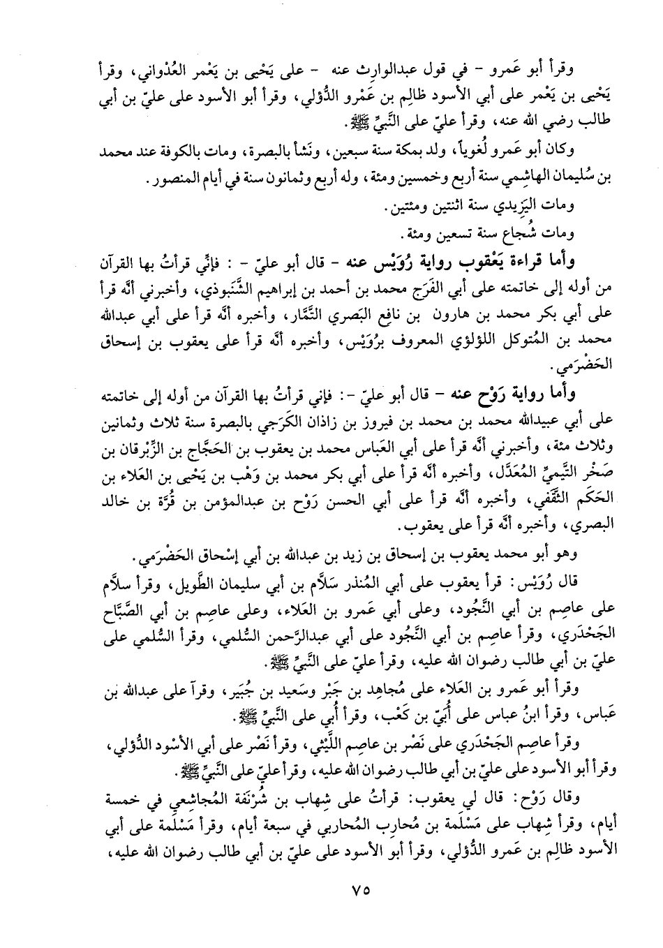 - قال أبو عليّ-: فإنّي قرأت بها القرآن من أوله إلى خاتمته على أبي الفرج محمد بن أحمد بن إبراهيم الشّنبوذي، وأخبرني أنّه قرأ على أبي بكر محمد بن هارون بن نافع البصري التّمّار، وأخبره أنّه قرأ على أبي عبد الله محمد بن المتوكل اللؤلؤي المعروف برويس، وأخبره أنّه قرأ على يعقوب بن إسحاق الحضرمي.