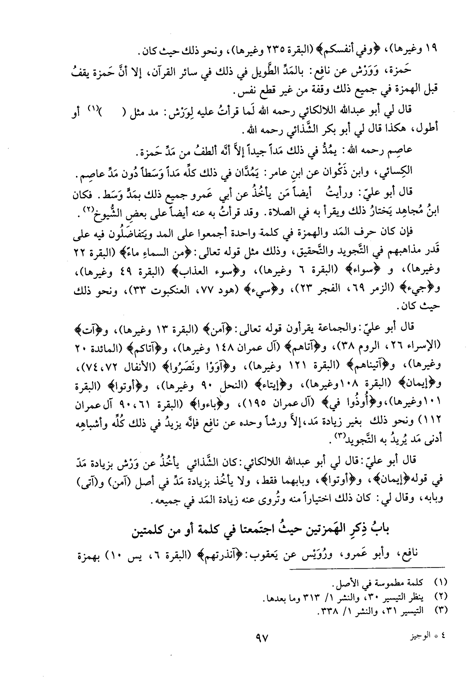 قال أبو عليّ: والجماعة يقرءون قوله تعالى: آمَنَ* (البقرة 13 وغيرها)، وآتِ* (الإسراء 26، الروم 38)، و (آتاهم) (آل عمران 148 وغيرها)، وآتاكُمْ* (المائدة 20 وغيرها)، وآتَيْناهُمُ* (البقرة 121 وغيرها)، وآوَوْا وَنَصَرُوا* (الأنفال 72، 74)، و (إيمان) (البقرة 108 وغيرها)، وإِيتاءِ* (النحل 90 وغيرها)، وأُوتُوا* (البقرة 101 وغيرها)، وأُوذُوا فِي (آل عمران 195)، وباؤُ* (البقرة 61، 90 آل عمران 112) ونحو ذلك بغير زيادة مد، إلّا ورشا وحده عن نافع فإنّه يزيد في ذلك كلّه وأشباهه أدنى مد يريد به التّجويد «3».