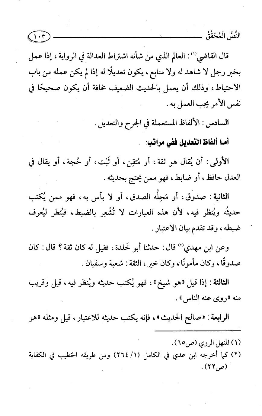 الأولى: أن يُقال هو ثقة، أو مُتقِن، أو ثَبْت، أو حُجة، أو يقال في العدل حافظ، أو ضابط، فهو ممن يحتج بحديثه.