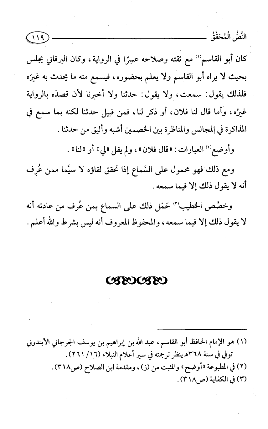 كان أبو القاسم (¬1) مع ثقته وصلاحه عسِراً في الرواية، وكان البرقاني يجلس بحيث لا يراه أبو القاسم ولا يعلم بحضوره، فيسمع منه ما يحدث به غيرَه فلذلك يقول: سمعت، ولا يقول: حدثنا ولا أخبرنا لأن قصدَه بالرواية غيرُه، وأما قال لنا فلان، أو ذكر لنا، فمن قبيل حدثنا لكنه بما سمع في المذاكرة في المجالس والمناظرة بين الخصمين أشبه وأليق من حدثنا.