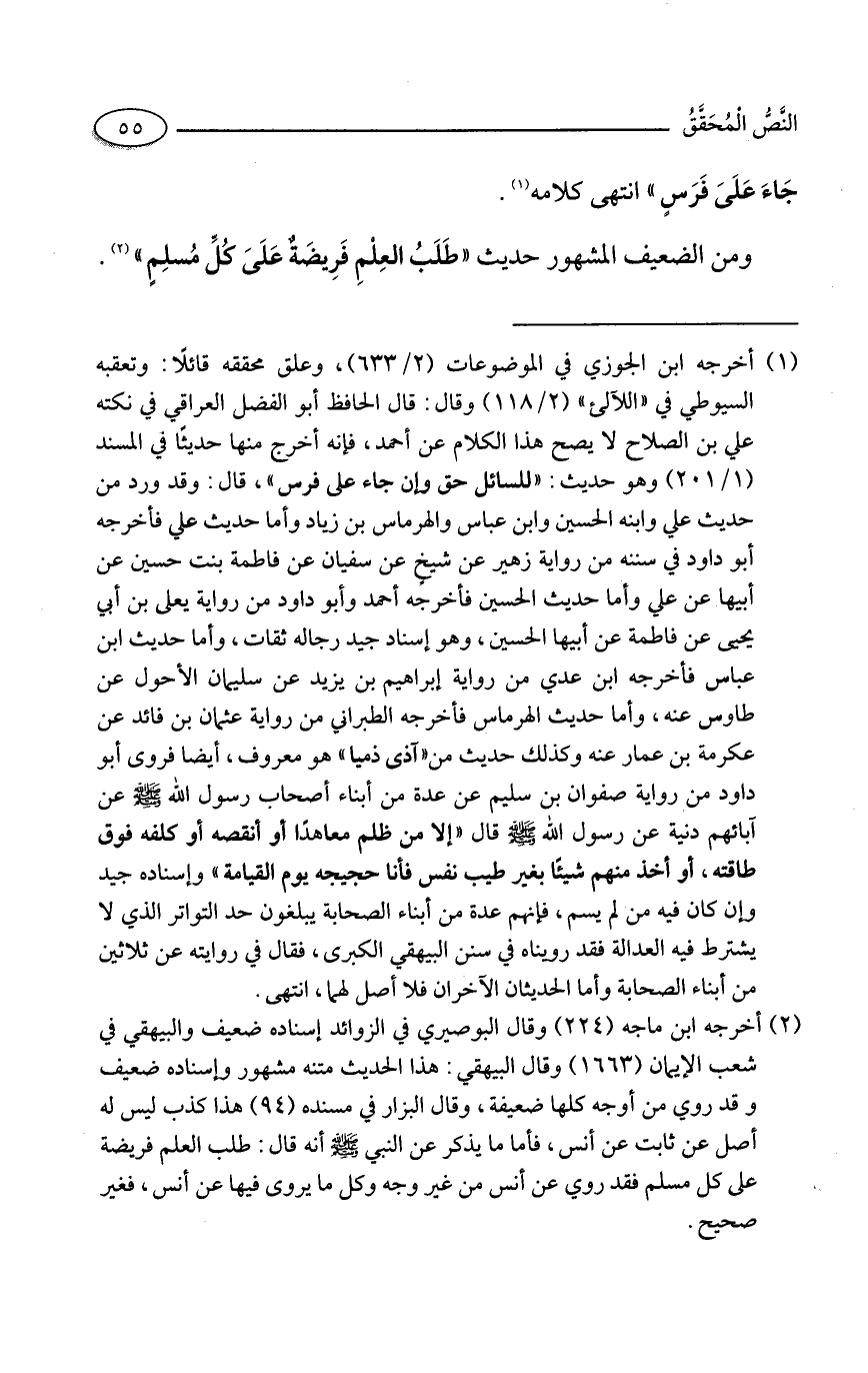 (¬2) أخرجه ابن ماجه (224) وقال البوصيري في الزوائد إسناده ضعيف والبيهقي في شعب الإيمان (1663) وقال البيهقي هذا الحديث متنه مشهور وإسناده ضعيف وقد روي من أوجه كلها ضعيفة، وقال البزار في مسنده (94) هذا كذب ليس له أصل عن ثابت عن أنس، فأما ما يذكر عن النبي - صلى الله عليه وسلم - أنه قال: طلب العلم فريضة على كل مسلم فقد روي عن أنس من غير وجه وكل ما يروى فيها عن أنس، فغير صحيح.