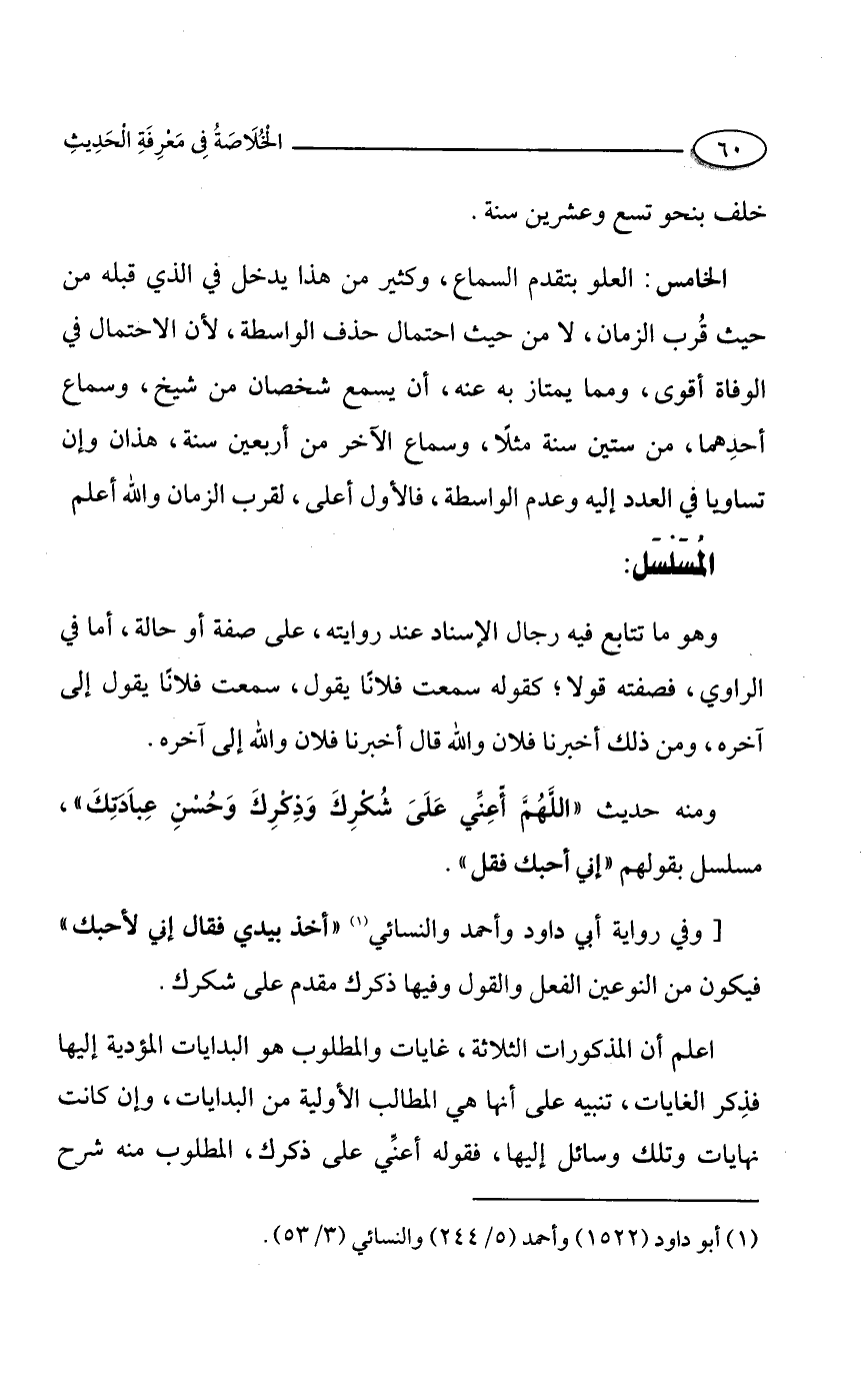 ومنه حديث"اللَّهُمَّ أّعِنِّي عَلَىَ شُكْرِكَ وَذِكْرِكَ وَحُسْنِ عِباَدَتِكَ"، مسلسل بقولهم "إني أحبك فقل".