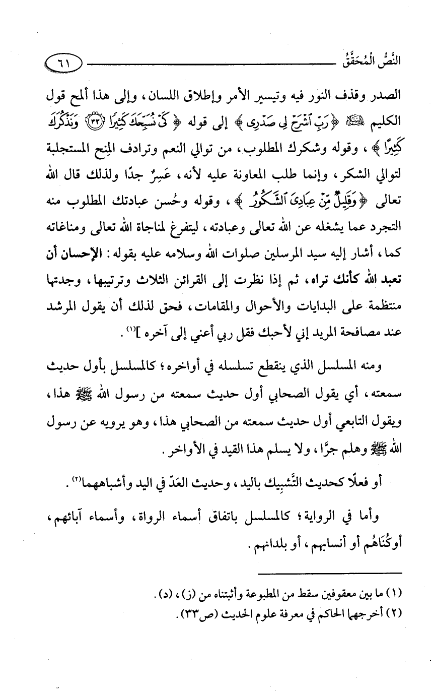 الصدر وقذف النور فيه وتيسير الأمر وإطلاق اللسان، وإلى هذا ألمح قول الكليم - عليه السلام - {رَبِّ اشْرَحْ لِي صَدْرِي} إلى قوله {كَيْ نُسَبِّحَكَ كَثِيرًا وَنَذْكُرَكَ كَثِيرًا}، وقوله وشكرك المطلوب، من توالي النعم وترادف المِنح المستجلبة لتوالي الشكر، وإنما طلب المعاونة عليه لأنه، عَسِرٌ جدًا ولذلك قال الله تعالى {وَقَلِيلٌ مِنْ عِبَادِيَ الشَّكُورُ}، وقوله وحُسن عبادتك المطلوب منه التجرد عما يشغله عن الله تعالى وعبادته، ليتفرغ لمناجاة الله تعالى ومناغاته كما، أشار إليه سيد المرسلين صلوات الله وسلامه عليه بقوله: الإحسان أن تعبد الله كأنك تراه، ثم إذا نظرت إلى القرائن الثلاث وترتيبها، وجدتها منتظمة على البدايات والأحوال والمقامات، فحق لذلك أن يقول المرشد عند مصافحة المريد إني لأحبك فقل ربي أعني إلى آخره] (¬1)