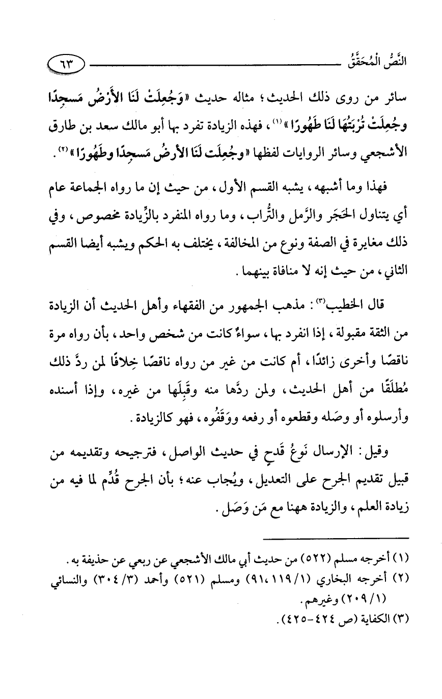 سائر من روى ذلك الحديث؛ مثاله حديث "وَجُعِلَتْ لَنَا الأَرْضُ مَسجِدًا وجُعِلَتْ تُرْبَتُهَا لَنَا طَهُورًا " (¬1)، فهذه الزيادة تفرد بها أبو مالك سعد بن طارق الأشجعي وسائر الروايات لفظها "وجُعِلَت لَنَا الأرضُ مَسجِدًا وطَهُورًا " (¬2).