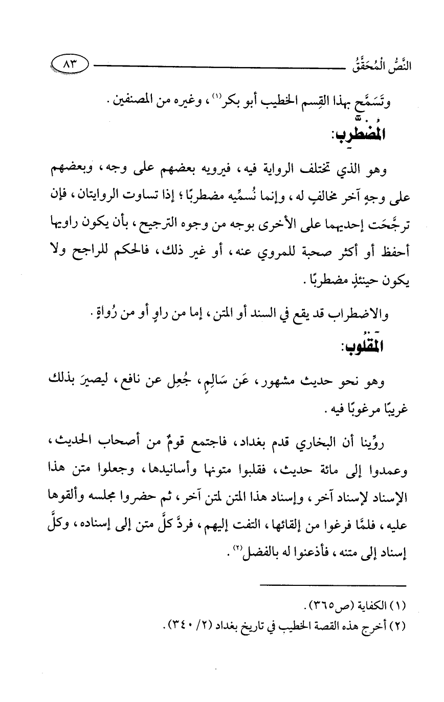 وهو الذي تختلف الرواية فيه، فيرويه بعضهم على وجه، وبعضهم على وجهٍ آخر مخالفٍ له، وإنما نُسمِّيه مضطربًا؛ إذا تساوت الروايتان، فإن ترجَّحَت إحديهما على الأخرى بوجه من وجوه الترجيح، بأن يكون راويها أحفظ أو أكثر صحبة للمروي عنه، أو غير ذلك، فالحكم للراجح ولا يكون حينئذٍ مضطربًا.